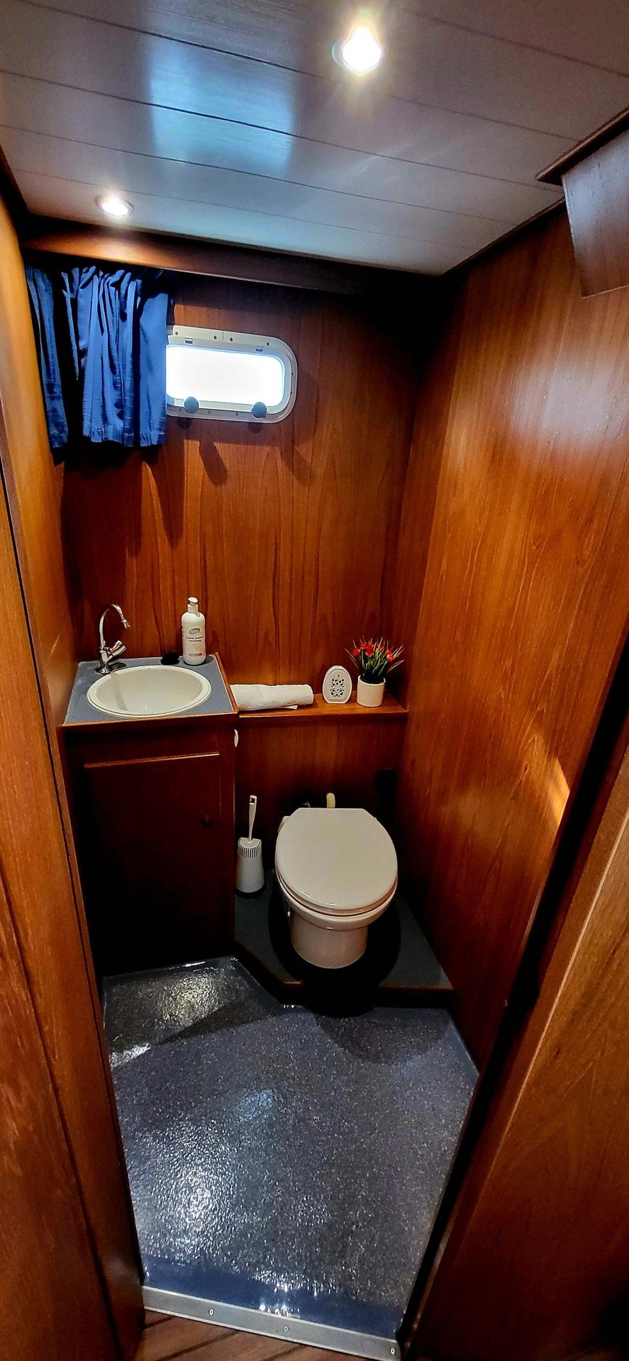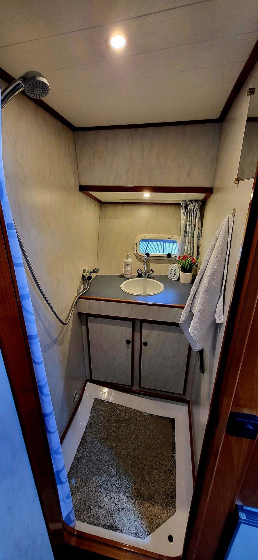 Het achterdek is royaal en biedt een fijne plek om te zitten, zelfs tijdens het varen. Dankzij de boeg- én hekschroef is de Voyager eenvoudig te manoeuvreren, ook in kleinere havens. Aan luxe geen gebrek: je hebt 230V stroom via een omvormer, twee koelkasten, een Nespresso-apparaat, eigen wifi en een televisie met automatische satellietontvangst.