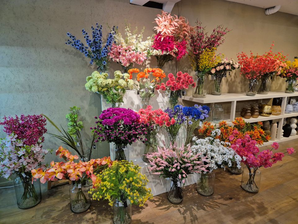 Zijden bloemen (plukwand); Heinen Delfts Blauw: vazen, accessoires, sieraden;