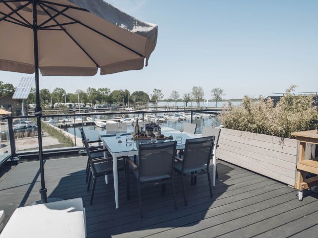 Het 2e net zo ruime terras vind je aan de achterkant en is voorzien van 2 grote loungebanken en tafeltjes. Vanaf dit terras heb je een prachtig uitzicht op het Sneekermeer.