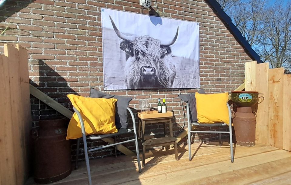 Op zoek naar een unieke overnachting? Wellicht is dan deze oude huifkar iets voor jou! De basic huifkar is gelegen in de natuur bij een paardenstal. De huifkar is geschikt voor twee personen en bestaat uit één ruimte. In deze ruimte is een gezellig zitje welke 's avonds eenvoudig omgebouwd kan worden tot een bed. Tevens is er een kleine kitchenette zonder gasfornuis met stromend water. I.v.m. de verzekering mag er niet gekookt worden. In de huifkar is eveneens een toiletje, douchen doe je bij de koude buitendouche. Buiten is ook een eco-toilet. Aangrenzend is de pluktuin. Hier kun je munt voor muntthee, kruiden etc. plukken. Via de tuin leid een trap je naar het dakterras waar je kunt genieten van een prachtig uitzicht over de weilanden. 's Ochtends vroeg zie je tijdens de zonsopgang vaak reeën en andere wilde dieren. Water komt uit eigen bron, maar is niet lekker om te drinken. Het beste neem je zelf flessen mee, maar water is eventueel ook te koop op de locatie. Deze accommodatie is te omschrijven als een trekkershut/natuurhuisje, maar dan met de luxe van elektra en een opgemaakt bed. Back to basic. Niet geschikt voor gasten met entomofobie of aversie tegen insecten.
