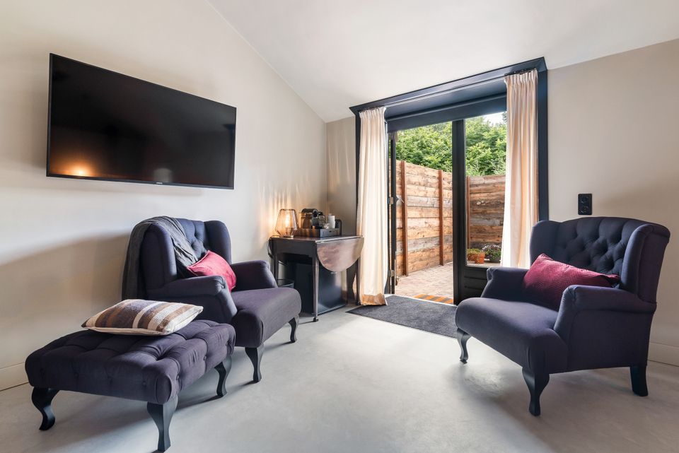 Deze sfeervolle kamer is gelegen op de begane grond van de B&B. De kamer is ruim opgezet met een luxe boxspring van Frieschen Bedden (180x210) en een gezellig zithoekje. De badkamer beschikt over een douche, toilet en twee wastafels waarbij een van de wastafels geschikt is voor rolstoelgebruikers. Via de openslaande tuindeuren kom je op je eigen terrasje waar je heerlijk van de zon kunt genieten.