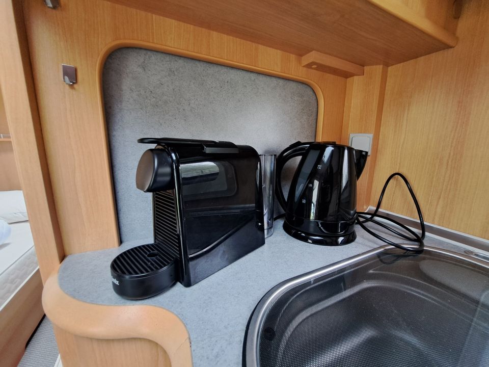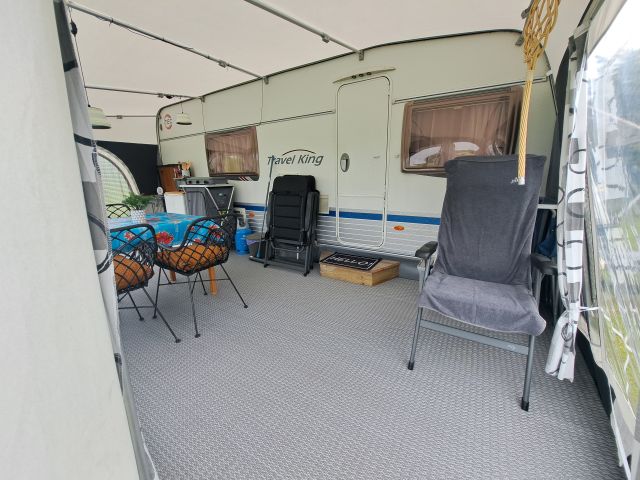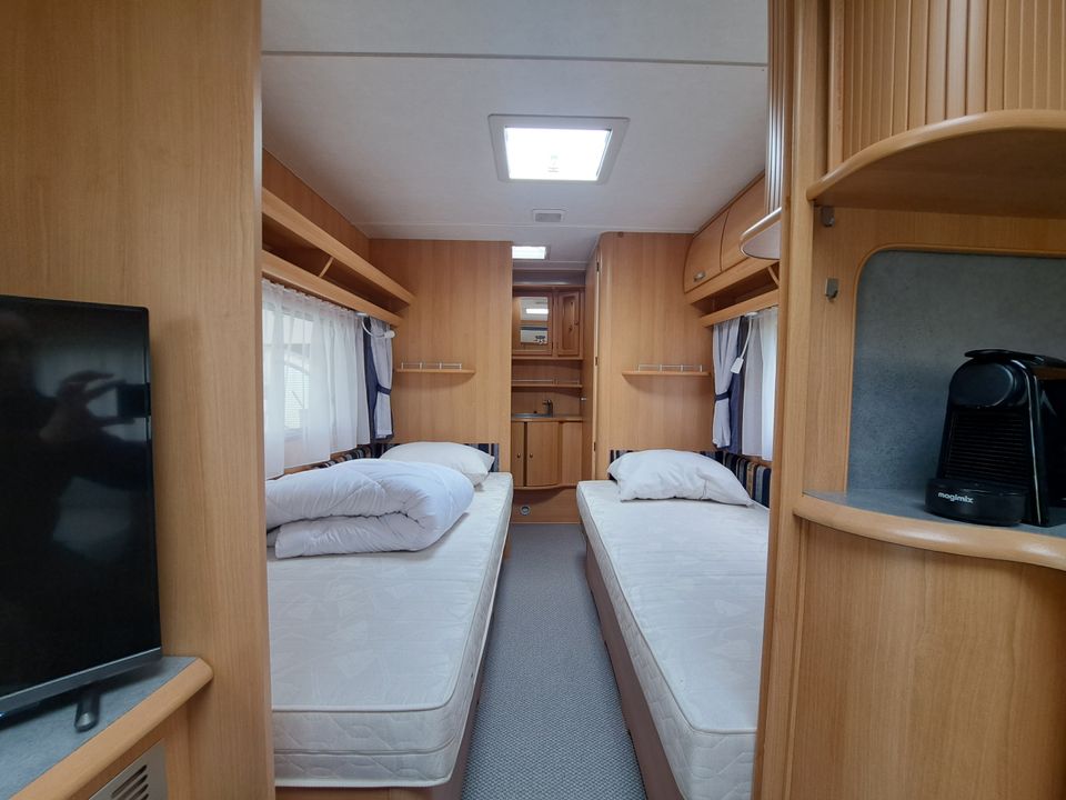 Geniet van het kampeergevoel in deze volledig ingerichte caravan voor vier personen, met voortent, toilet en comfortabele slaapruimtes.