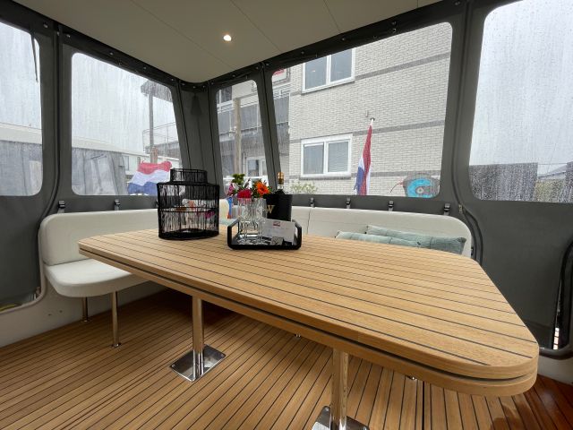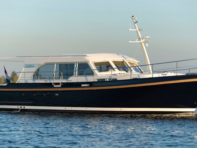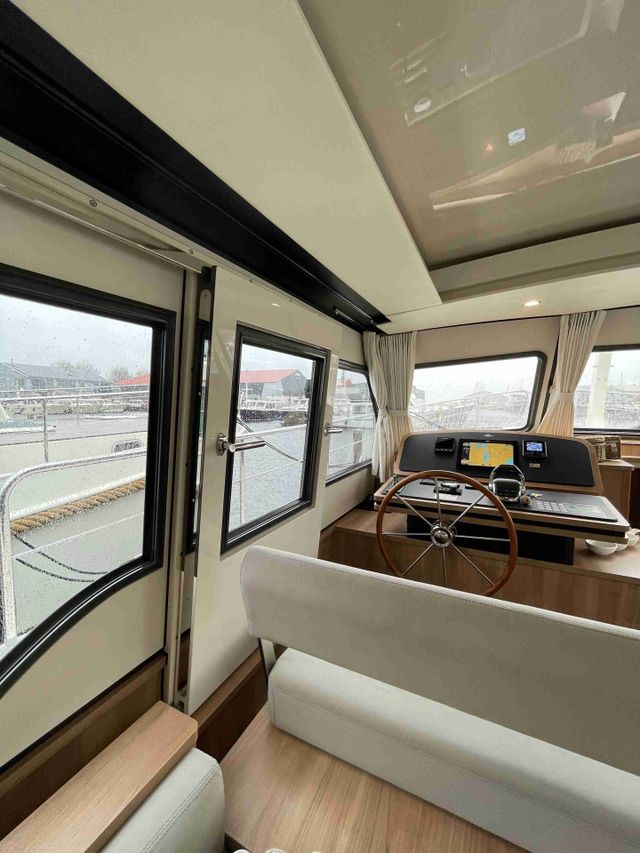 De stuurstand is uitgerust met een zeer compleet navigatiepakket, een twee-persoons stuurbank en aan BB-zijde een schuifdeur. Tevens een full-roof schuifdak, wat het vrij gevoel geeft dat je buiten zit. De boot is uitgerust met twee slaaphutten. Een hut heeft een vrijstaand 2-persoonsbed en de andere hut heeft 2 een-persoonsbedden. Verder is er aan een ruime badkamer en een toilet. De keuken is volledig uitgerust voor een lang en prettig verblijf aan boord. In de kuip is een fijne royale bank en een eettafel. De open kuip heeft een doorlopende long-top met sfeervolle verlichting. De kuip kan geheel worden afgesloten tot een verlenging van de salon. Al de jachten zijn uitgerust met een boeg- en hekschroef.