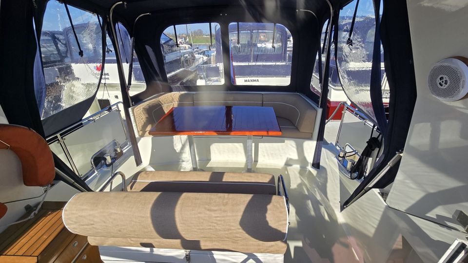 Het schip is uitgerust met airconditioning en dubbel glas, wat bijdraagt aan extra comfort. Het zonnedek met teakhouten vloer is voorzien van een XL-cabriotent, vaste zitbank, windscherm, zonnepaneel, tweede stuurstand met GPS-kaartplotter en een handige dekwaspomp. Op het zwemplateau vind je een zwemtrap en buitendouche.