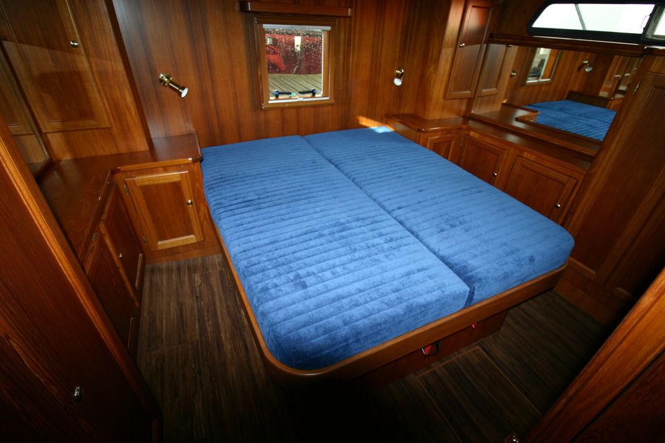 In de achterkajuit geniet je van een royaal tweepersoonsbed met lattenbodem. Ook hier is een tweede, zeer ruime badkamer aanwezig met elektrisch toilet, wastafel en een grote douche.