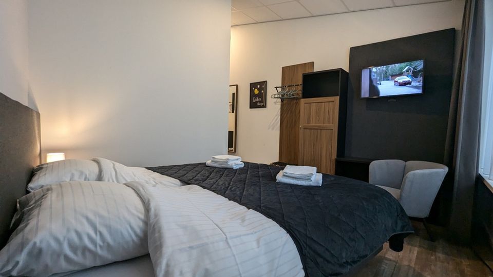 Het slaapgedeelte in de kamer is uitgerust met twee comfortabele kingsize hotelbedden, ruime kastruimte, kledinghangers en een fauteuil. De 42-inch digitale televisie beschikt over een standaard zenderpakket, en via de HDMI–USB-C-aansluiting koppel je eenvoudig je eigen laptop, telefoon of tablet. De kamer heeft een ruime, afsluitbare badkamer met een vrij/bezet-slot, voorzien van een douche en toilet. Er is een spiegelkast met hygiëneproducten en een haardroger. De douchecabine beschikt over een comfortabele regendouche voor een ontspannen start van de dag. Tot slot heeft elke kamer een kitchenette met koelkast, opbergruimte, een gootsteen en een combimagnetron. De ronde zitplek kan gebruikt worden als werkruimte of om een eenvoudige maaltijd te nuttigen.