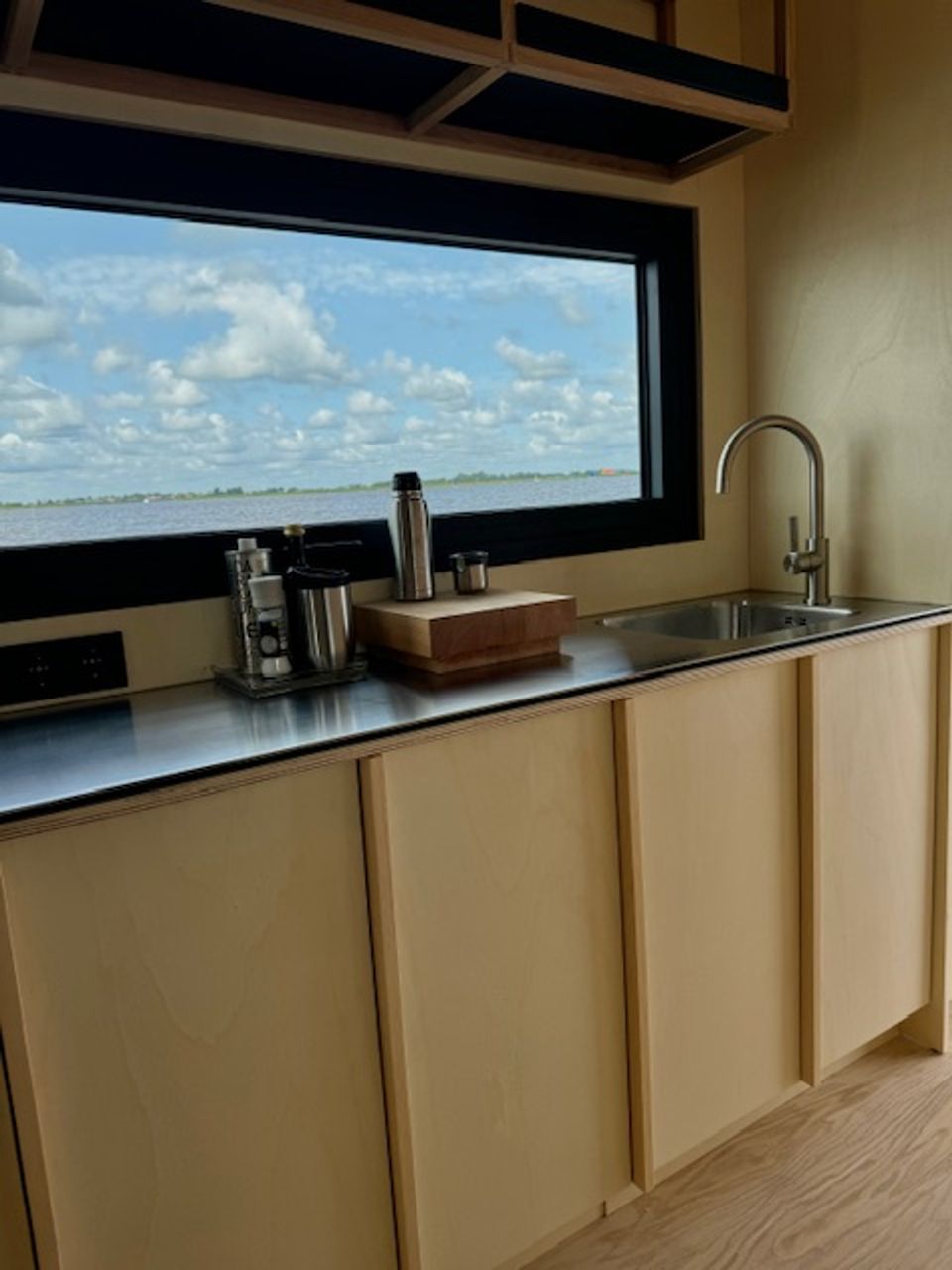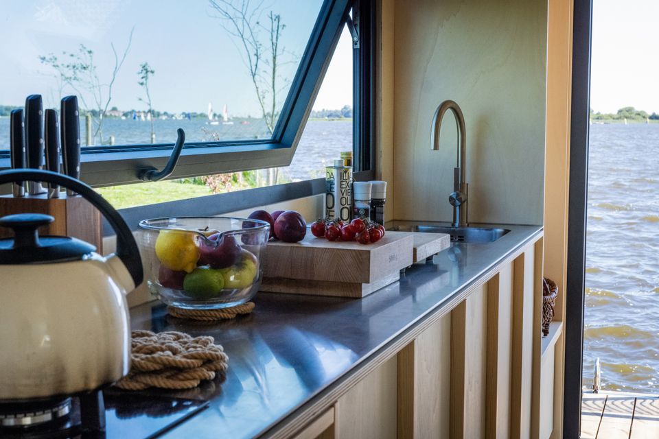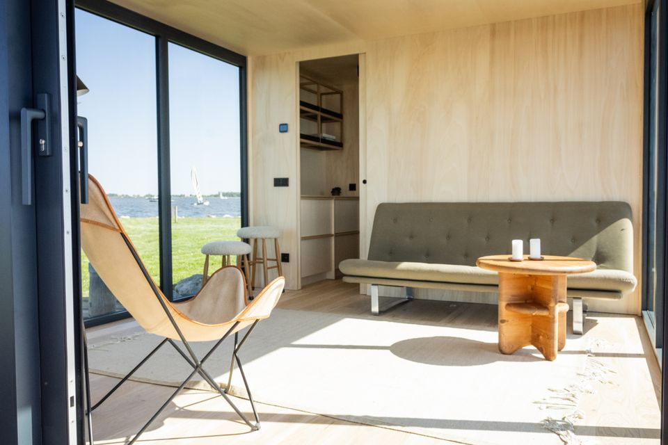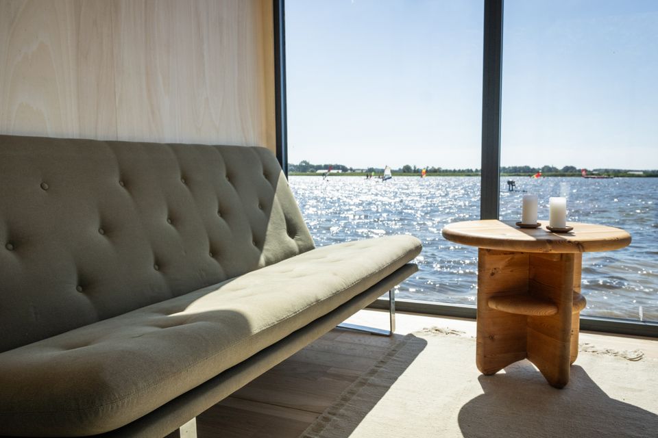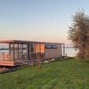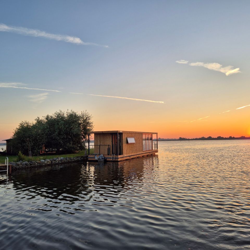 Prachtig drijvend vakantiehuis op een privé eiland! Het slaapgedeelte beschikt over een tweepersoonsbed van 140 × 200 cm dat met schuifdeuren kan worden afgesloten voor extra privacy. Nachtlampjes en een handig hangend opbergvak maken het tot een knusse en praktische ruimte. In de tweede slaapkamer staat een stapelbed van 80 × 200 cm, en alle bedden zijn voorzien van opberglades voor extra gemak. De lounge biedt een panoramisch uitzicht dankzij de ramen van vloer tot plafond, die de natuur als decor naar binnen halen. Een comfortabele Artifort-bank nodigt uit om te ontspannen, terwijl een verplaatsbare tafel zowel geschikt is om aan te dineren als voor andere doeleinden. De keuken is volledig uitgerust en efficiënt georganiseerd. Een ingebouwde koelkast met vriesvak, een mini-kookplaat en een geïntegreerde gootsteen maken koken eenvoudig. Het slimme opbergsysteem biedt volop ruimte dankzij het 25 × 25 opbergsysteem, gecombineerd met lades en kasten onder het aanrecht. De badkamer, hoewel compact, is volledig uitgerust met een comfortabele douche, een kleine wastafel en een doorspoelbaar toilet. Alles is ontworpen om het verblijf zo comfortabel en aangenaam mogelijk te maken, terwijl de natuur in al haar pracht centraal blijft staan.