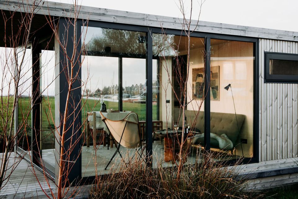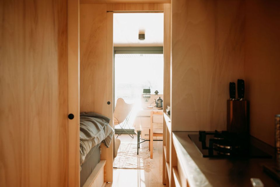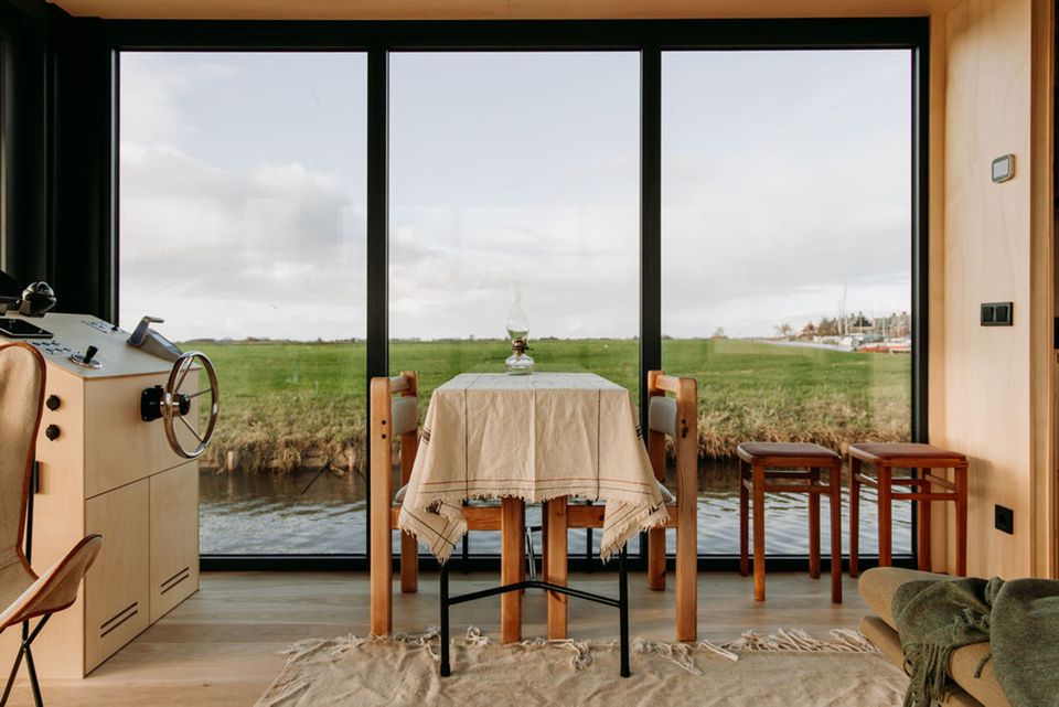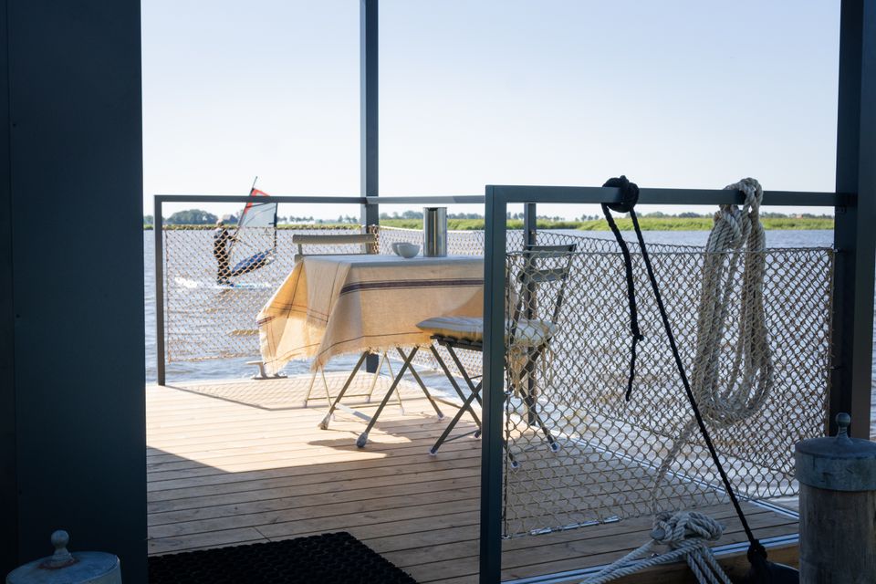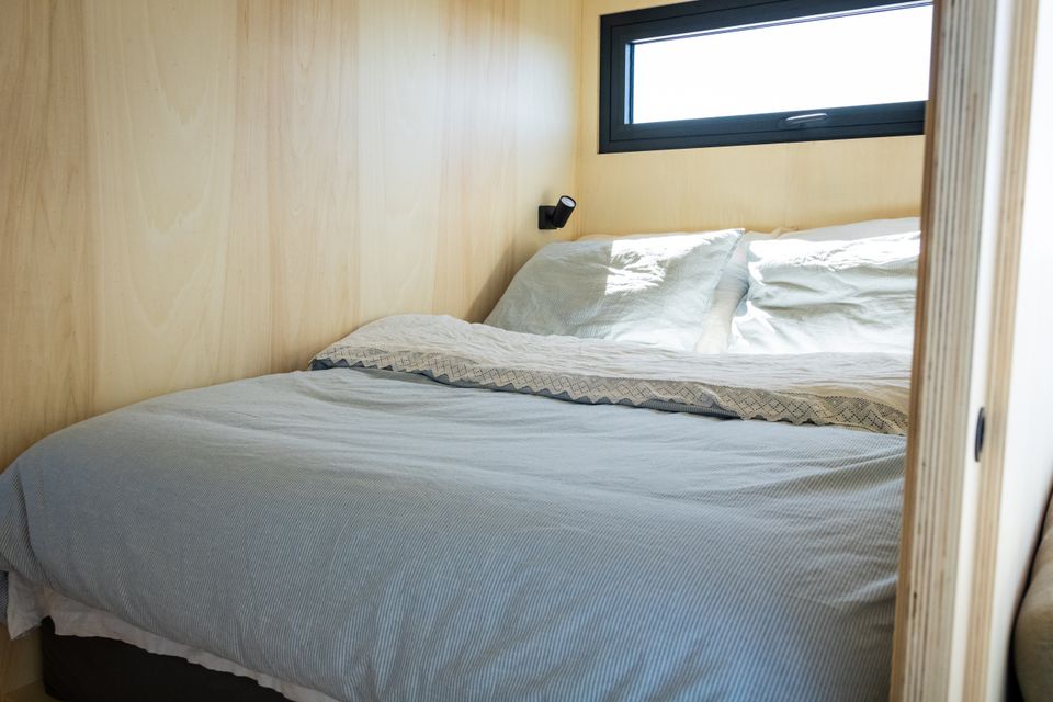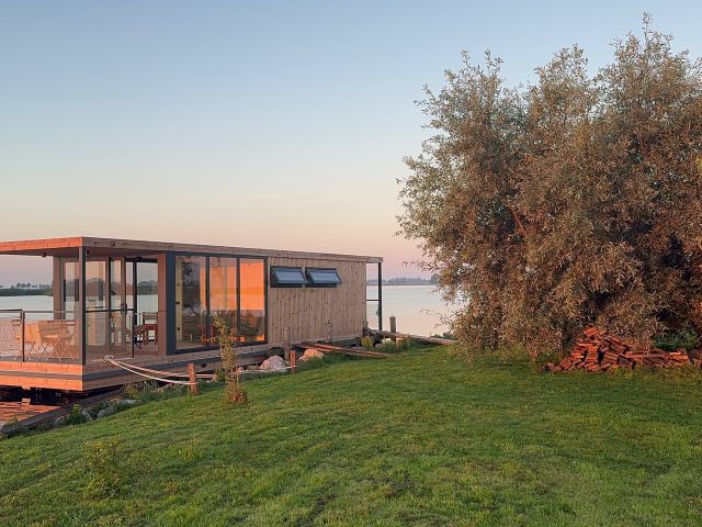 Prachtig drijvend vakantiehuis op een privé eiland! Het slaapgedeelte beschikt over een tweepersoonsbed van 140 × 200 cm dat met schuifdeure…