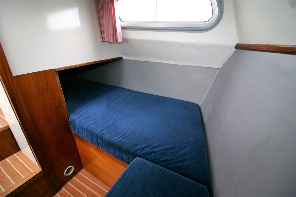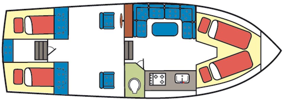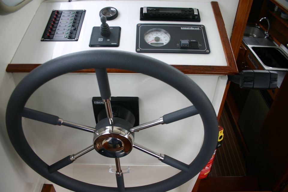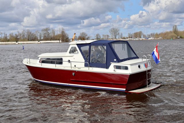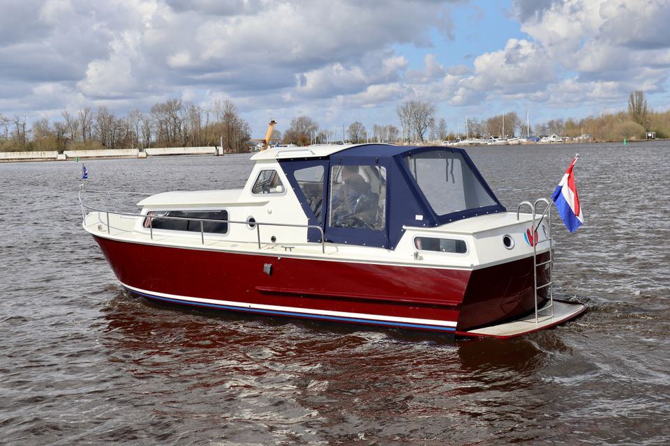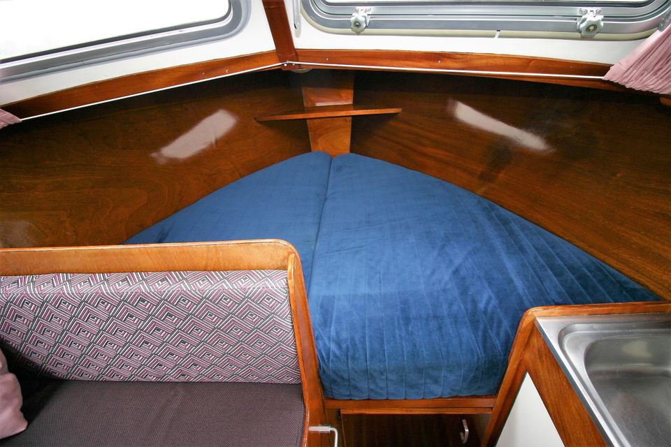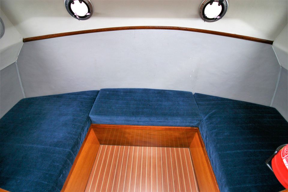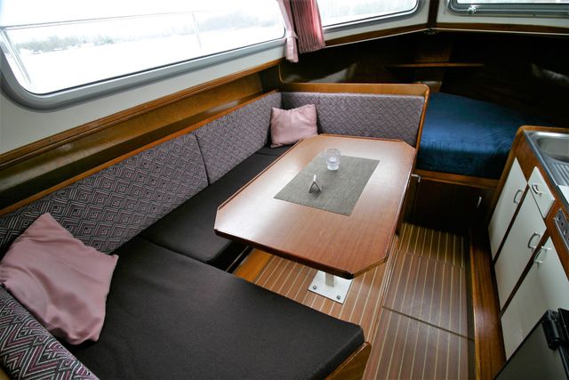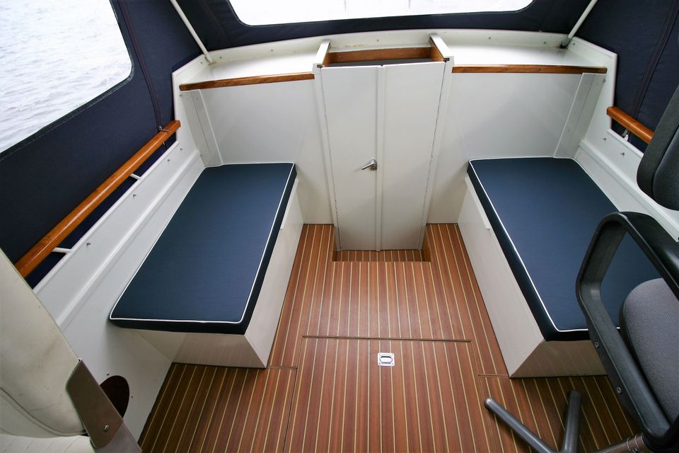 Indeling: In de voorkajuit vind je een tweepersoons slaapplaats, een dinette en een keuken met warm en koud stromend water, een 3-pits kooktoestel, koelkast en een complete inventaris voor 5 personen. Er is ook een elektrisch toilet en een zonnepaneel aan boord. De stuurhut heeft een overzichtelijke stuurstand en biedt zitplaats aan vier personen. In de achterkajuit zijn twee eenpersoonsbedden en extra bergruimte aanwezig. Achterop vind je een vaste zwemtrap voor een makkelijke toegang tot het water.