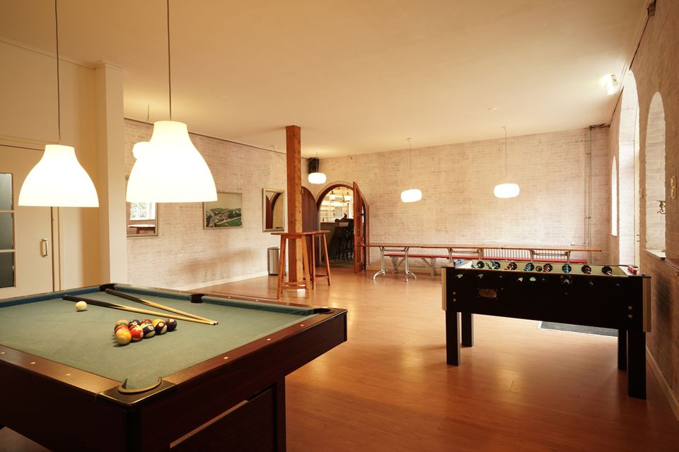 Deze groepsaccommodatie heeft een zeer ruime woonruimte met diverse zit- en eethoeken, een bar met biertap en muziek installatie evenals een openhaard. In de recreatieruimte staan een poolbiljart, tafelvoetbal en dartbord. Evenals nog meer zitgelegenheid en openslaande deuren naar het terras aan het water met overdekt terras en barbecue. Er is een speelkamer voor kinderen met diverse spelletjes, speelgoed en heel veel knuffels. De grote professionele keuken beschikt over een tienpitsfornuis, vaatwasser, diverse koelkasten en nog veel meer voorzieningen. Tevens is er op de begane grond een rolstoelvriendelijke slaapkamer met eigen badkamer. Op de eerste verdieping zijn 15 slaapkamers gerealiseerd waarvan 11 kamers beschikken over twee eenpersoonsbedden. Er is een slaapkamer met tweepersoonsbed, een vierpersoonskamer en ten slotte zijn er nog twee tienpersoonsslaapkamers met elk vijf stapelbedden. Bovendien zijn er twee kinderbedjes beschikbaar.