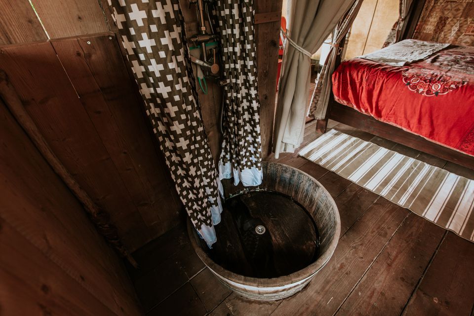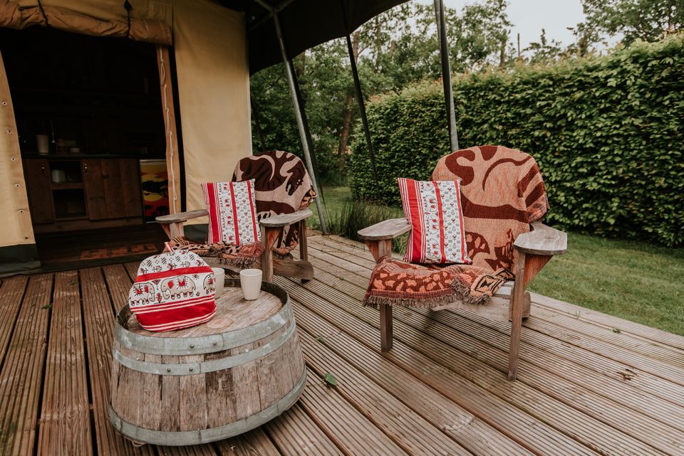 Onze tiny house en tenten staan op het gras. Misschien ben je een ervaren kampeerder, maar we zeggen het toch maar even: laarzen of klompen zijn handig om mee te nemen in verband met dauw op het gras 's ochtends vroeg - net als iets tegen de muggen als je 's avonds nog buiten wilt zitten.