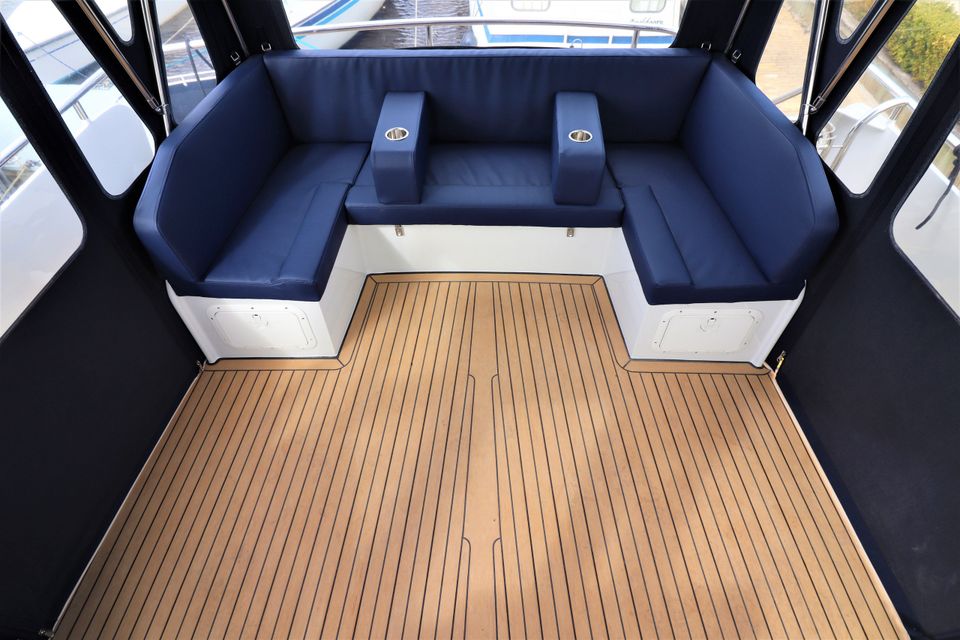 Het schip is uitgerust met dubbel glas voor extra comfort. Op het ruime zonnedek vind je een vaste U-bank, een XL-cabriotent, windscherm, zonnepaneel en een stuurstand met GPS-kaartplotter. Via een geïntegreerde wenteltrap met led-verlichting bereik je het zwemplateau met zwemtrap.