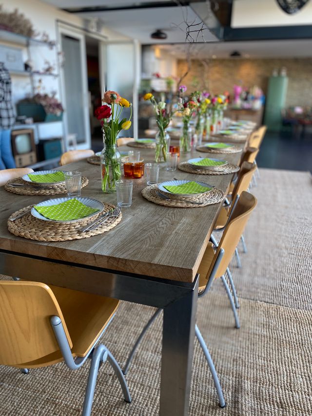 Wij zorgen met liefde voor koffie, thee en zelfgebakken appeltaart. Voor lunch koken we met seizoensproducten uit eigen tuin of werken we samen met lokale cateraars die net als wij geloven in gezonde en met zorg bereide maaltijden.