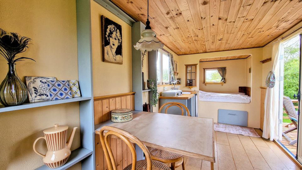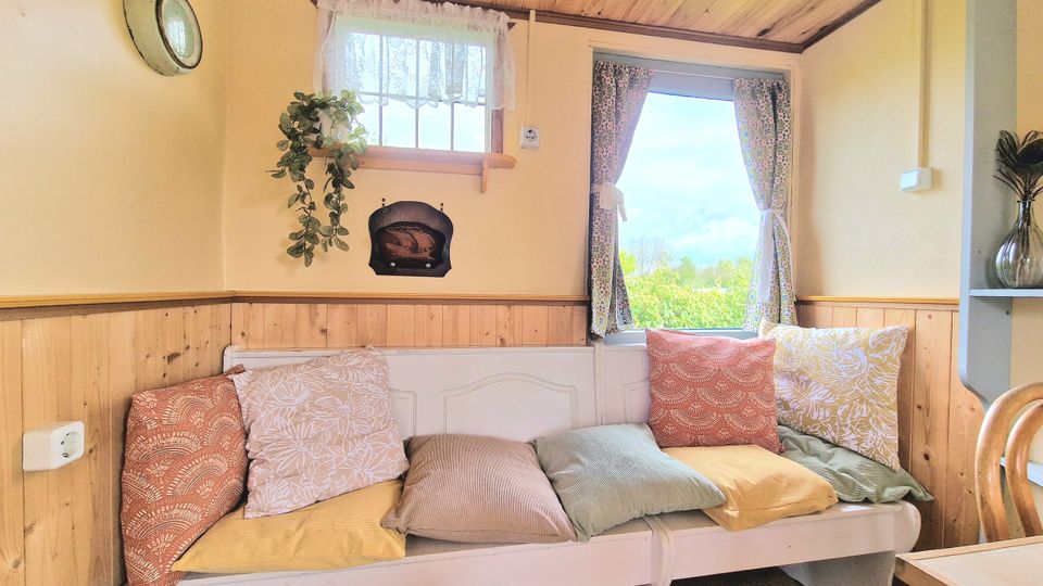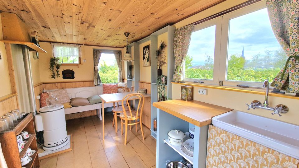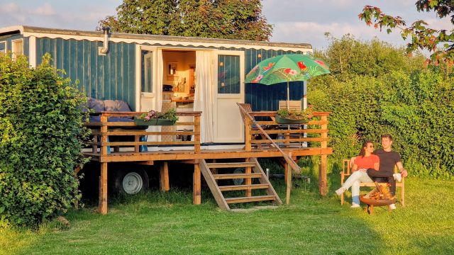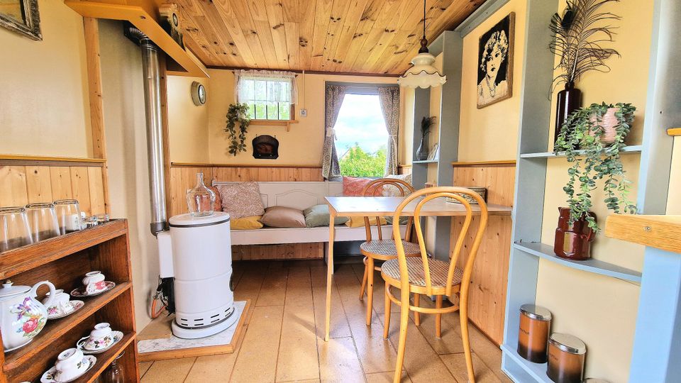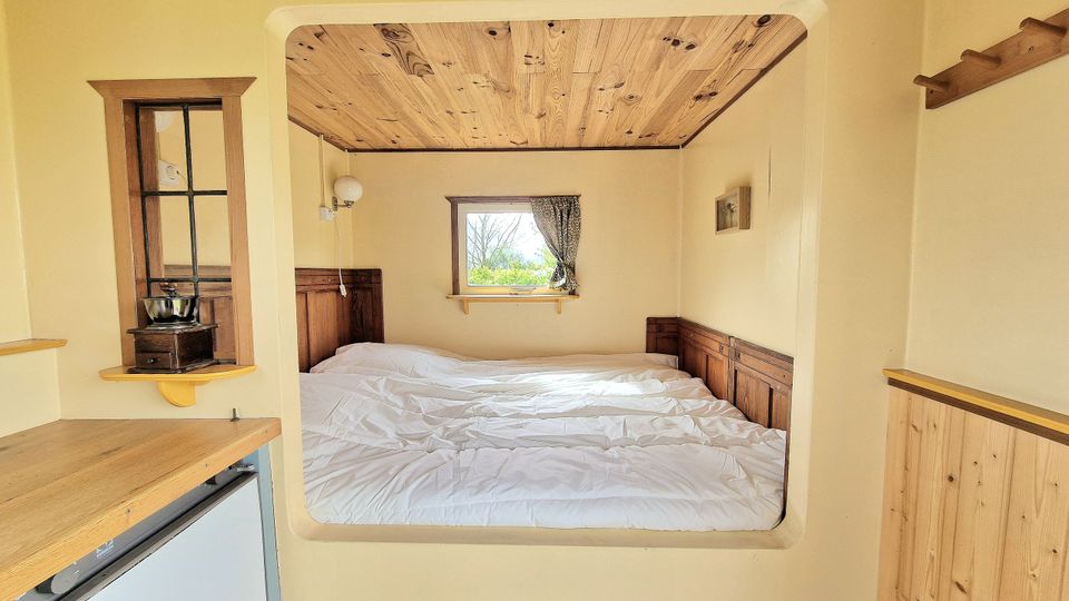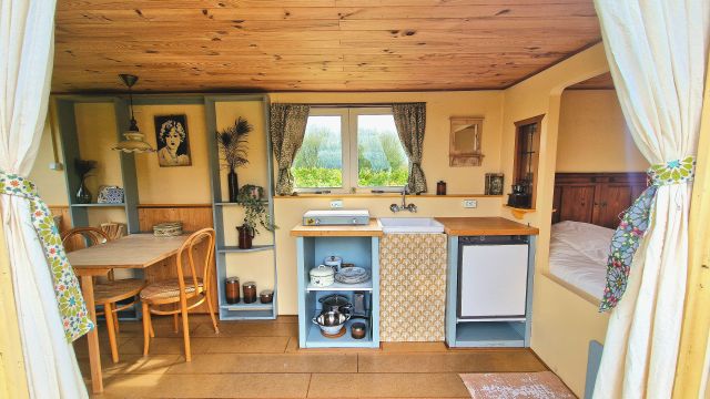 Deze gezellige pipowagen beschikt over een bedstee, een compleet keukentje en een eigen veranda met prachtig uitzicht over de Franekervaart en weilanden. Binnen eet je aan het nostalgische tafeltje en op koudere dagen zorgt het gaskacheltje voor warmte. Het sanitair gebouw biedt gratis douches, toiletten en een afwasplek met warm water.