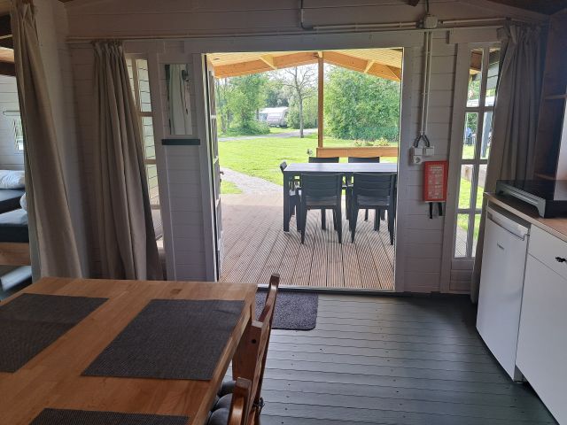 Een mooie en gezellige blokhut voor maximaal 6 personen. Als u binnenloopt zit er aan de linker kant een keukentje met kooktoestel, keukengerei, bestek en porselein inbegrepen, koffiezetapparaat (Dolce Gusto), koelkast en inductie kookplaat voor extra gemak. Ook staat er een eettafel wat meer aan de linker kant. In de blokhut zitten 2 eenpersoons bedden en 2 stapelbedden. Deze accommodatie heeft een overdekt terras dus ook met regenachtig weer kunt u genieten van de buitenlucht. Het sanitair gebouw is vlakbij de blokhut. U dient zelf mee te nemen: Onderlaken, dekbedovertrek en kussensloop.
