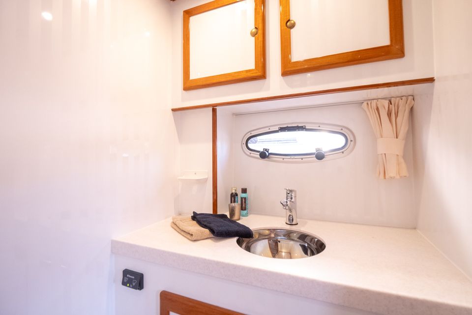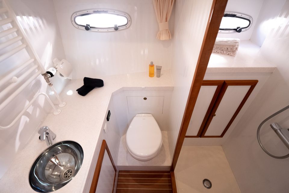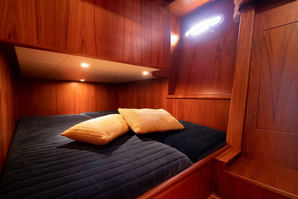 Met drie hutten, zes vaste slaapplaatsen, meerdere badkamers en een ruim achterdek vaar je tot maximaal zeven personen ontspannen door Friesland.