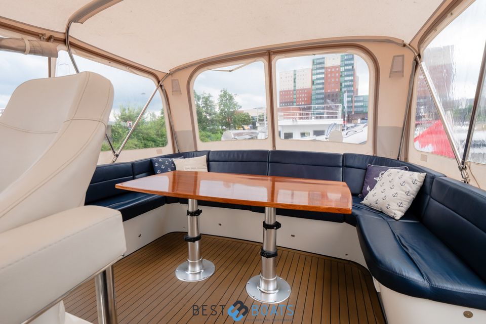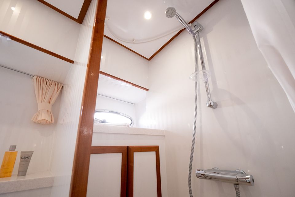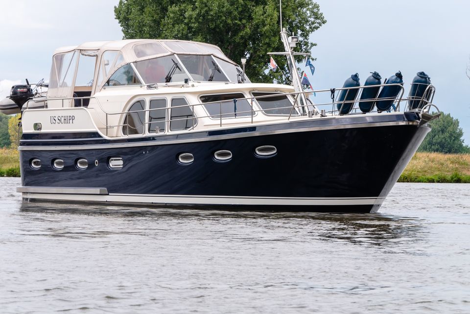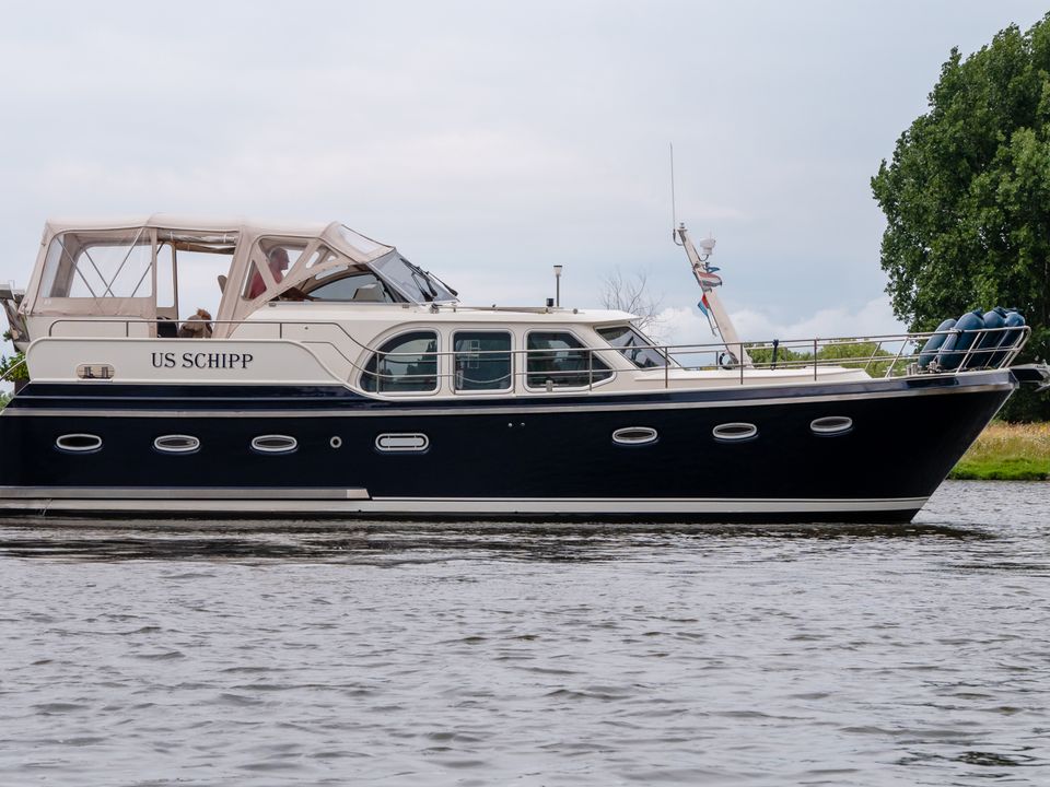 Stap aan boord van het ruime motorjacht De Drait Deluxe 42 'Us Schipp' en geniet van comfort en vrijheid op het water. Dit schip is van alle gemakken voorzien. Door de grote achtertent welke voorzien is van een ruime rondzit, zit je warm, droog en comfortabel. Deze beschikt ook over muggenhorren, waardoor je er het gehele seizoen comfortabel zit. Ook is het zwemplateau toegankelijk door de grote trappen vanaf het achterdek.