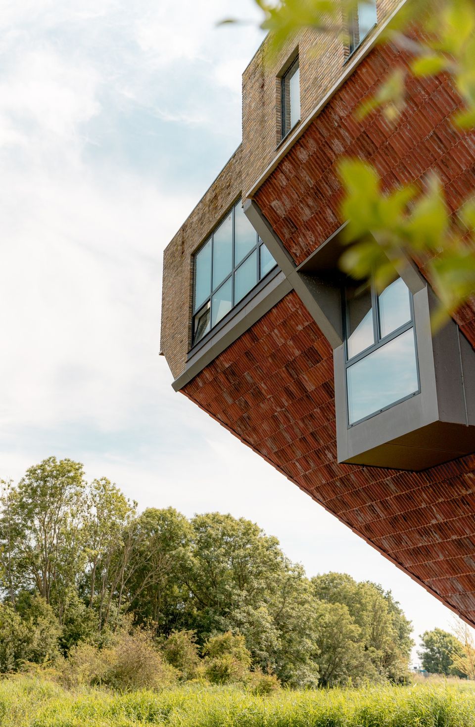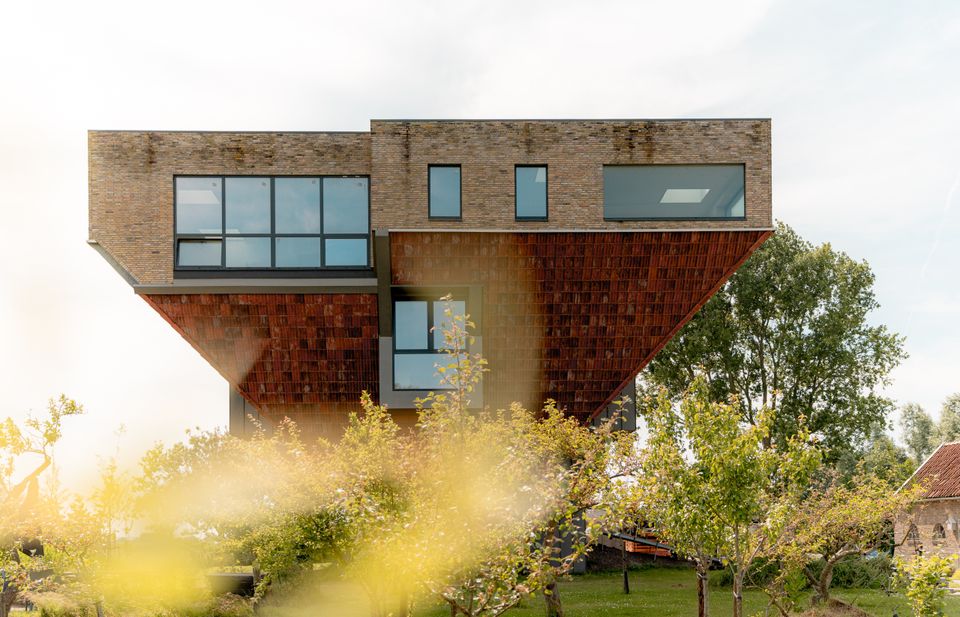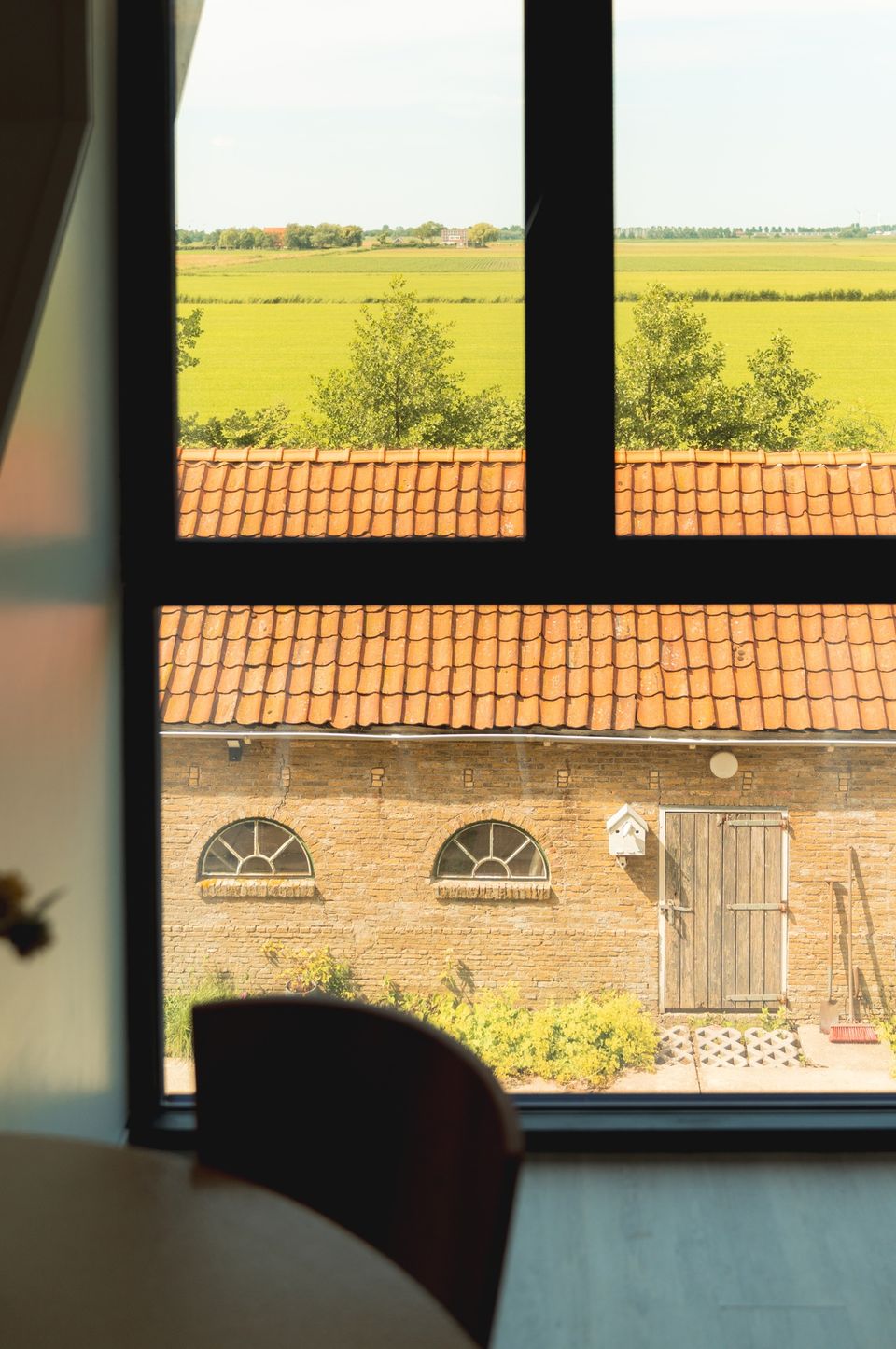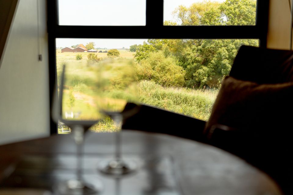 Binnen zorgen de schuine wanden en grote ramen voor veel licht en een open gevoel. Je kijkt de hele dag uit over het landschap en richting het IJsselmeer, van zonsopkomst tot zonsondergang.