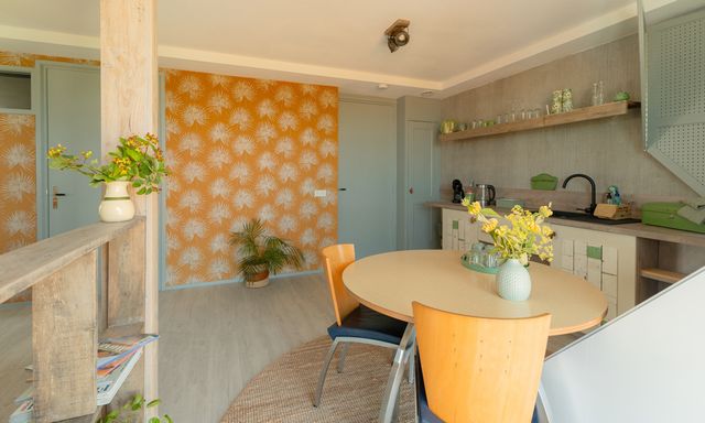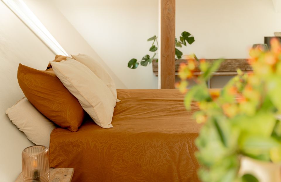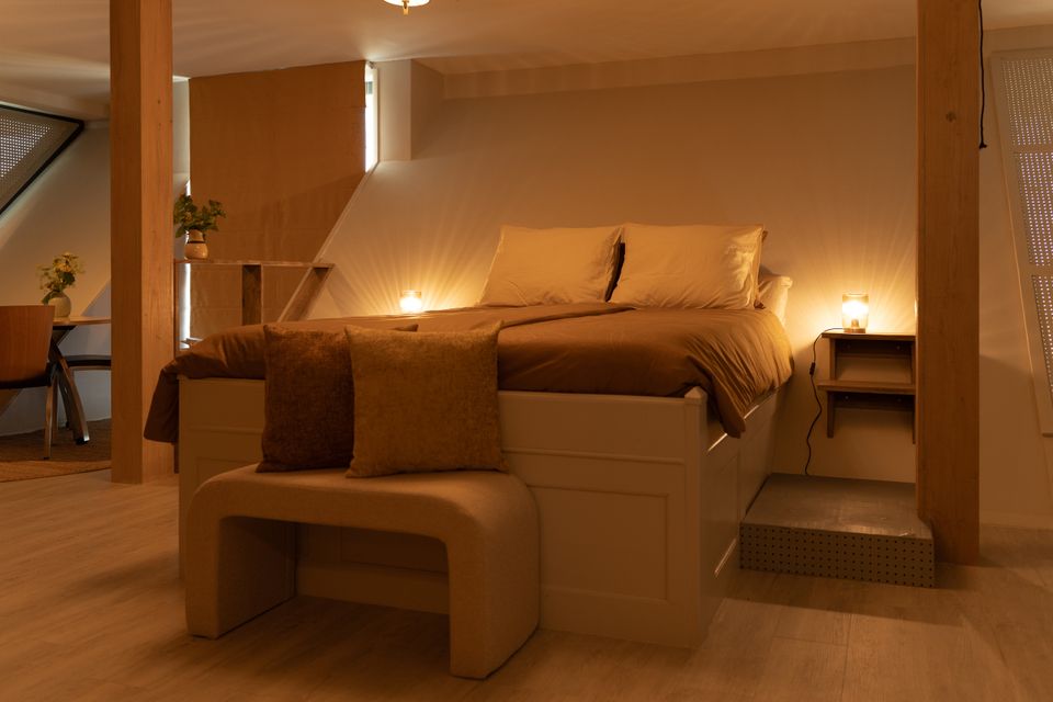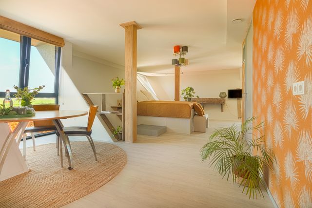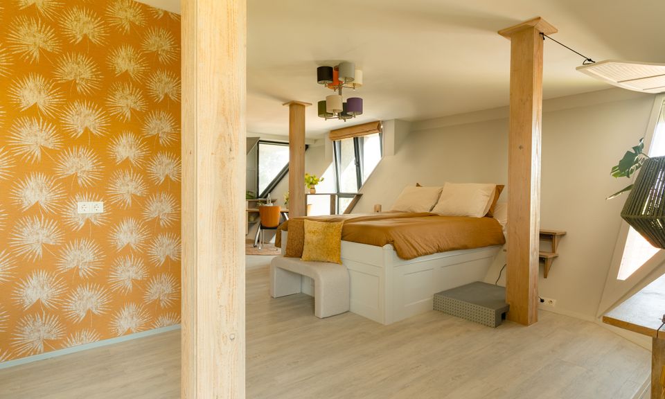 Het appartement ligt op de eerste etage en voelt licht en ruim door de schuine wanden en grote ramen. De open indeling combineert slapen en relaxed zitten in één ruimte met een rustige en eigentijdse inrichting.