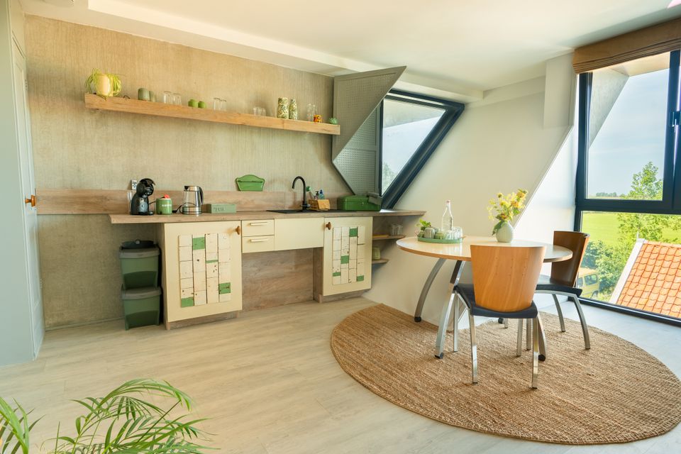 Het bijzondere zit in de plek én het gebouw. Je verblijft in een appartement in een op de kop gebouwde boerderij, wat het meteen anders maakt dan een standaard verblijf!