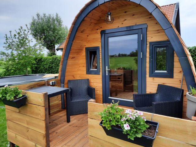 Met een verblijf in deze campingpod kun je kamperen met comfort! Je komt binnen in het knusse hutje met een zithoek, slaapruimte en keukenblokje. In de opbergkast staat een koelkast, waterkoker en koffiezetapparaat. Via de glazen deuren kom je op de veranda waar een zitplaats is en je een mooi uitzicht over de landerijen hebt. De campingpod heeft geen eigen sanitair, maar je kunt gebruik maken van het nabij gelegen sanitair gebouw.