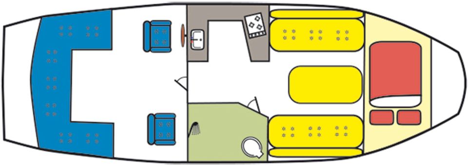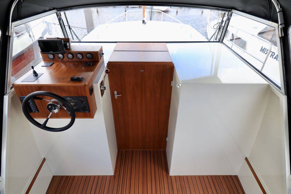 Indeling: In de voorkajuit vind je een tweepersoons slaapplaats, een dinette en een keuken met warm en koud stromend water, een 2-pits kooktoestel, koelkast en een complete inventaris voor 4 personen. De boot is uitgerust met een elektrisch toilet en een douche. De stuurhut heeft een overzichtelijke stuurstand, vier zitplaatsen en extra bergruimte. Achterop vind je een vaste zwemtrap, handig voor een frisse duik of om gemakkelijk aan en van boord te stappen.