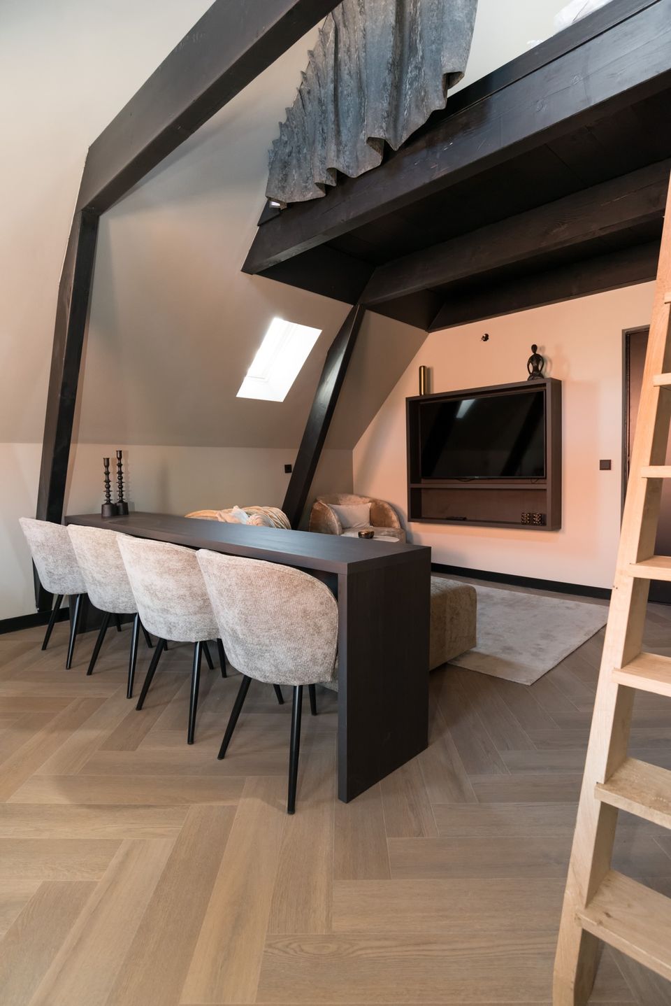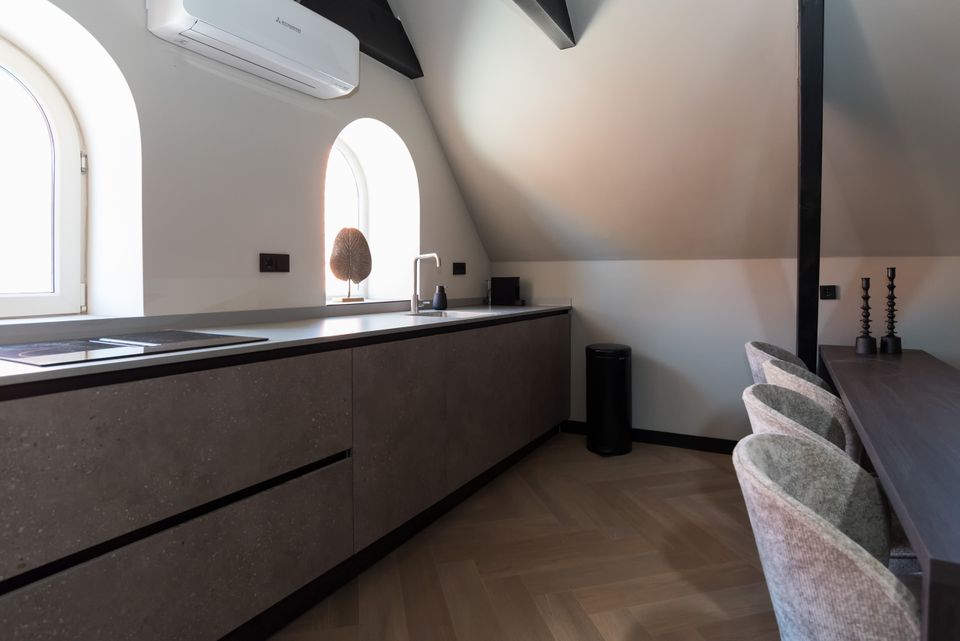 Dit vierpersoons appartement op de tweede verdieping heeft een slaapkamer met tweepersoonsbed en luxe badkamer en een extra slaapkamer op de vide. De woonkamer met moderne keuken en de airconditioning in het hele appartement zorgen voor extra comfort. De inrichting in warme goud- en zwarttinten geeft het geheel een stijlvolle uitstraling. Een ideale plek voor een comfortabel verblijf in Sneek.