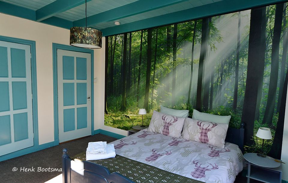 Ruime tweepersoonskamer met bos thema en uitzicht op de landerijen
