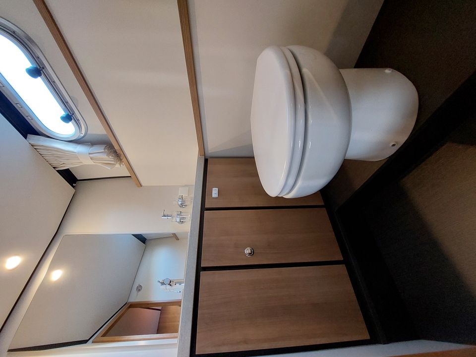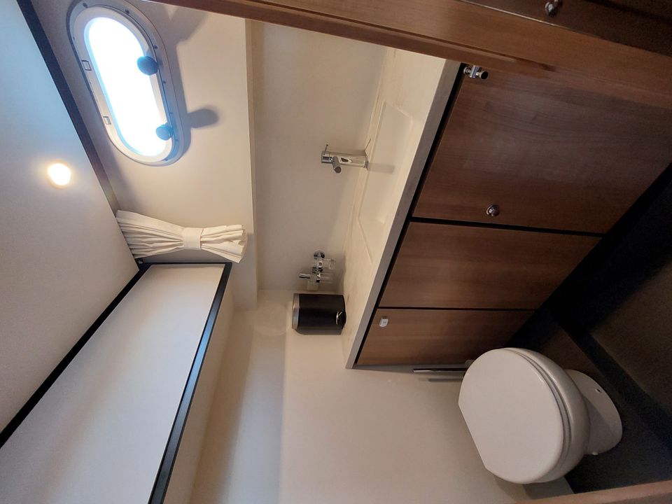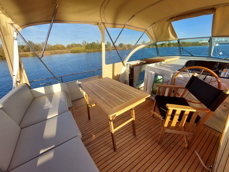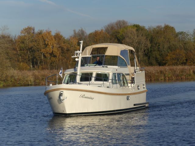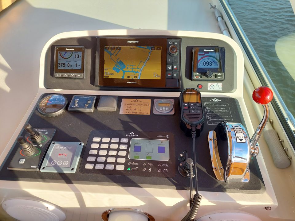 Een ideaal jacht voor het varen over de Friese meren. Met de stuurstand op het bovendek vaar je heerlijk in de buitenlucht, de verstelbare cabriokap maakt het varen in alle jaargetijden een fantastische beleving! De Linssen Grand Sturdy heeft een ruim bovendek met een zeer uitgebreid besturing- en navigatiesysteem met o.a. boeg- en hekschroef. En is tevens verwarmd zodat ook bij minder mooi weer het aangenaam vertoeven is aan boord en tijdens het varen. Er is een stijlvolle salon met veel (dag)licht afgewerkt in prachtige lichte kleurstelling. Er zijn twee ruime slaapvertrekken met heerlijke bedden en extra dikke matrassen en eigen ensuite sanitaire ruimtes. Dit luxe en comfortabele schip voor vier volwassenen beschikt over perfecte vaareigenschappen en is uitgerust met heel veel opties! Het schip beschikt over een zonnepaneel waardoor de accu's tijdens de zon-uren extra bijgeladen worden. Het schip heeft zowel 12 Volt als een 220 Volt aansluiting, onderweg beschik je altijd over stroom. Sluit de walstroomkabel aan wanneer je aanlegt in een van de vele havens die Friesland en Nederland rijk is. Een compleet ingebouwd audio systeem én fraai weggewerkte televisie met Digitenne in HD kwaliteit vind je uiteraard aan boord van dit fantastische jacht. Langs de gangboorden stap je gemakkelijk aan weerszijden op het schip of op het zwemplateau. Op het zwemplateau bevindt zich een bun met o.a. de gasfles (veilig buiten boord) en een rvs zwemtrap is aanwezig. Ook bevindt zich op het zwemplateau een tweede douche met warm en koud water. Dit schip beschikt over extra handvatten om veilig via het zwemplateau het achterdek te betreden.