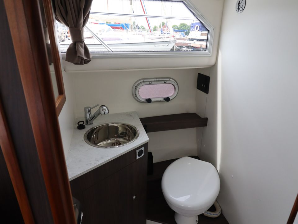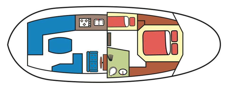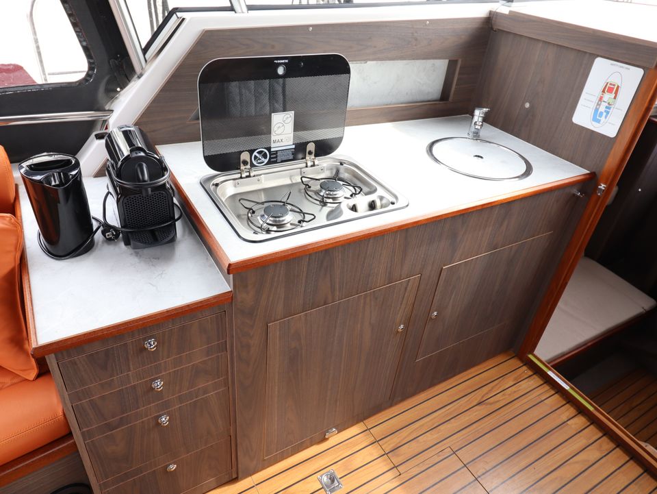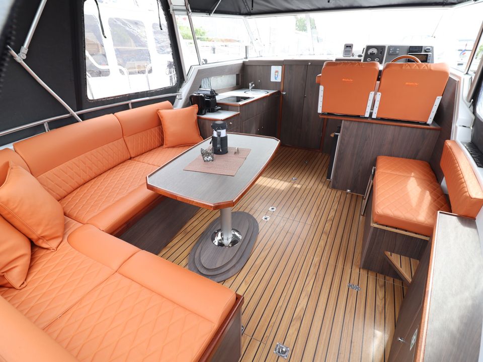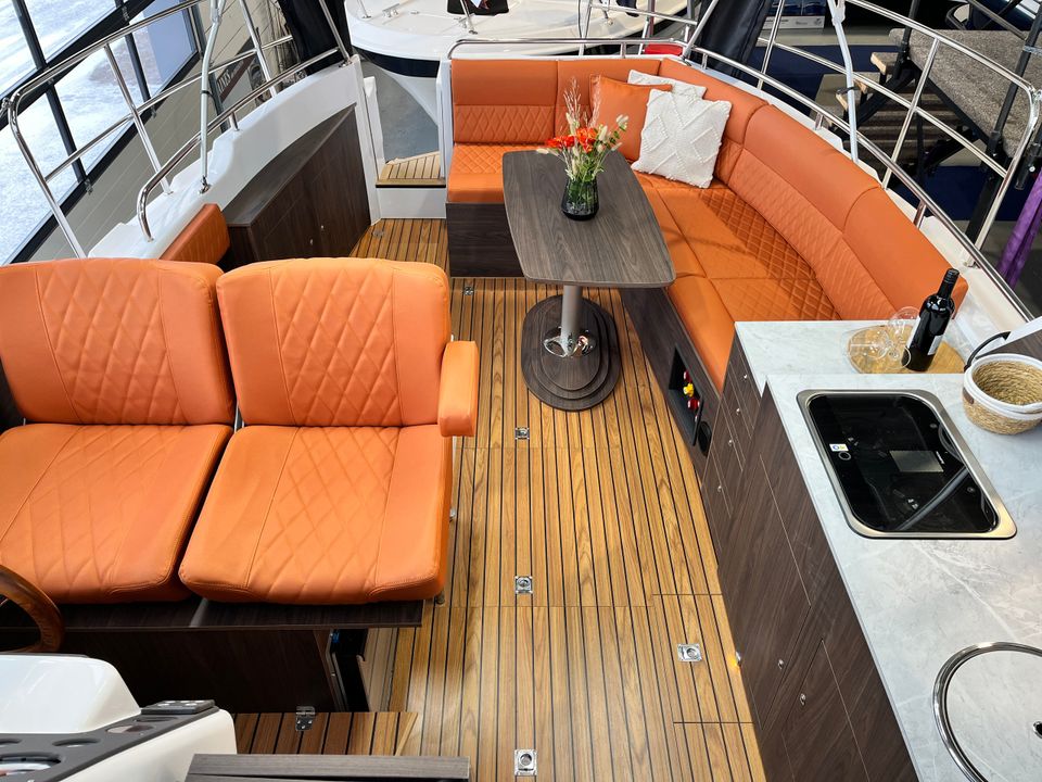 Je stapt de ruime open kuip binnen via het gangboord of het zwemplateau met spiegeldeur. De kuip is ingedeeld met twee comfortabele zitgroepen tegenover elkaar, een praktische keuken en een overzichtelijke stuurstand – alles op gelijk niveau. Zo heb je overal rondom perfect uitzicht en geniet je ontspannen van het water.