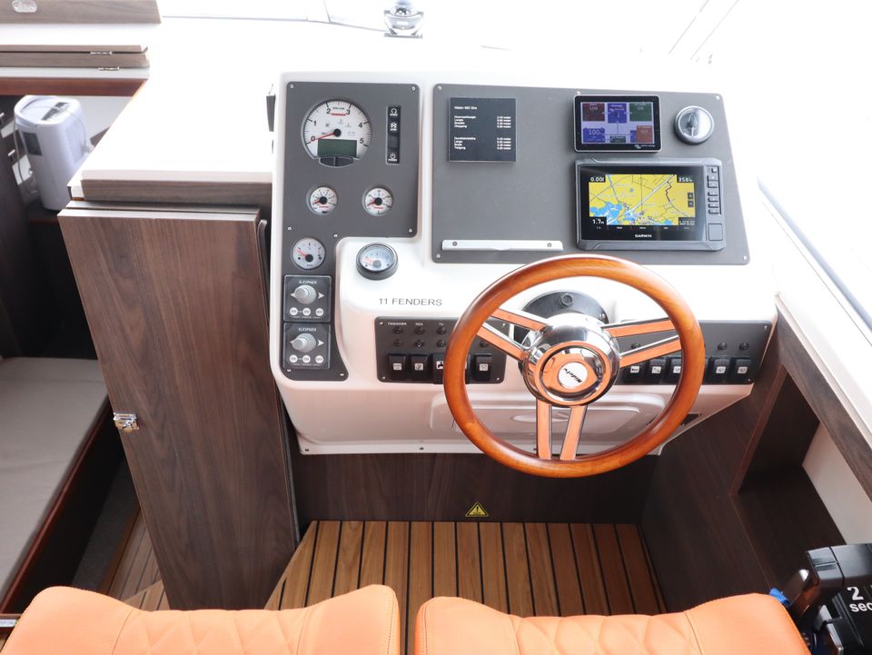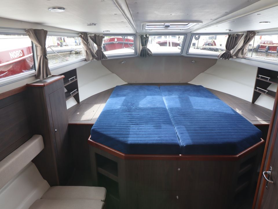 De Nidelv 965 Sira is slim en comfortabel ingedeeld, met volop doordachte details. Denk aan energiezuinige LED-verlichting, dimbare lampen in de voorkajuit, luxe leeslampjes met USB-laadpunt, soft-close lades, oriëntatieverlichting in de kuip en extra veel bergruimte – onder het bed én onder de kuipvloer. Zelfs bij de stuurstand vind je een dubbel USB-laadpunt.
