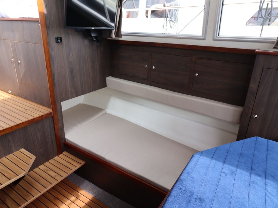 In de voorkajuit bevindt zich de eigenaarshut met een royaal vrijstaand tweepersoonsbed, een extra slaapbank en een ensuite badkamer met elektrisch toilet, wastafel en handdouche.