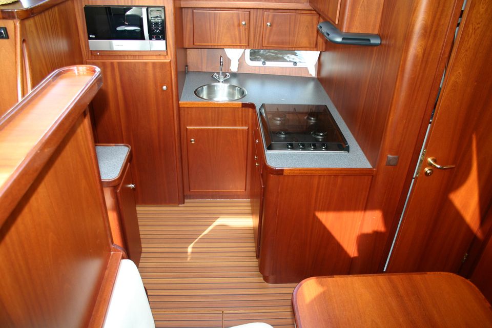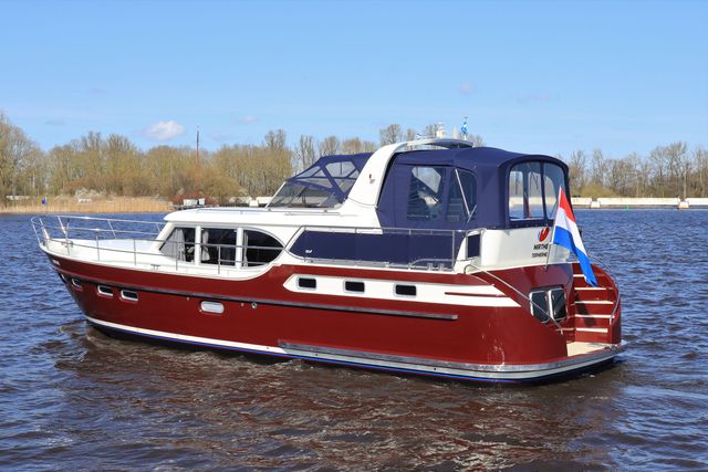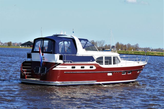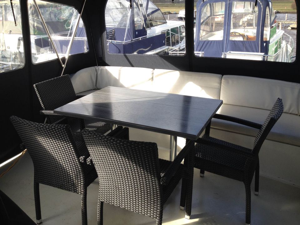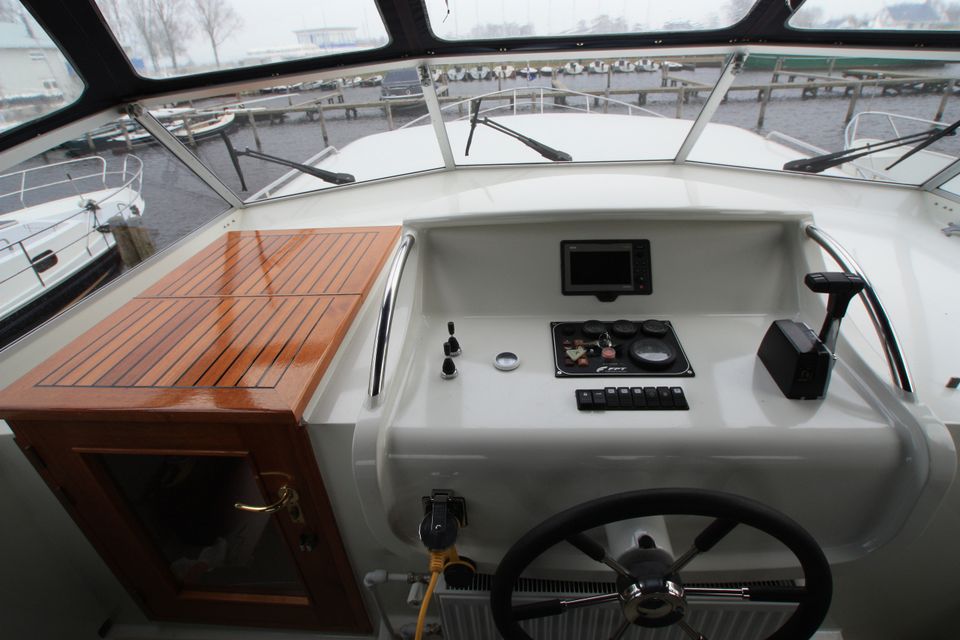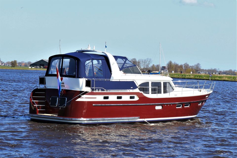 Buiten geniet je van de bovenstuurstand met centrale verwarming, GPS, kaartplotter, dieptemeter, zonnepaneel en een 220V omvormer. Dankzij de boeg- en hekschroef manoeuvreer je het jacht gemakkelijk. De XL-cabriotent met vaste zitbank maakt het zonnedek extra comfortabel. Via de geïntegreerde wenteltrap stap je eenvoudig aan of van boord via het zwemplateau met zwemtrap.
