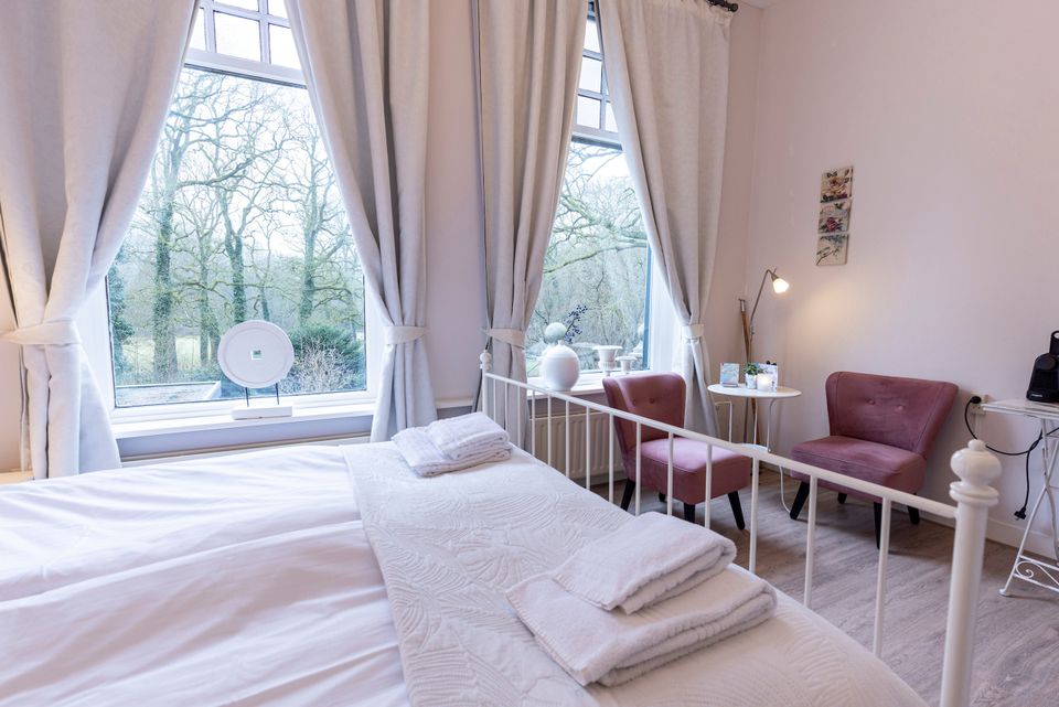 Deze romantische kamer ligt aan de achterzijde van de B&B en biedt een prachtig uitzicht over het Rijsterbos. De kamer is gelegen op de eerste verdieping en middels een ruime trap te bereiken. De kamer is comfortabel en beschikt over een knus tweepersoonsbed (180x210). Daarnaast heb je een zitje met twee fijne stoelen en is er een tv. Je spullen berg je eenvoudig op in de kast. Bij het zitje staat een senseo-koffiezetapparaat en een waterkoker, je kunt dus zelf nog een kopje koffie of thee zetten! Je hebt een eigen badkamer met douche, toilet en wastafel.