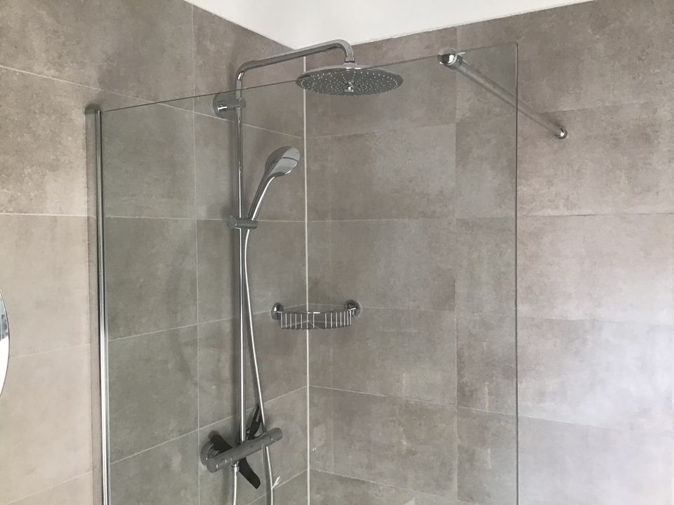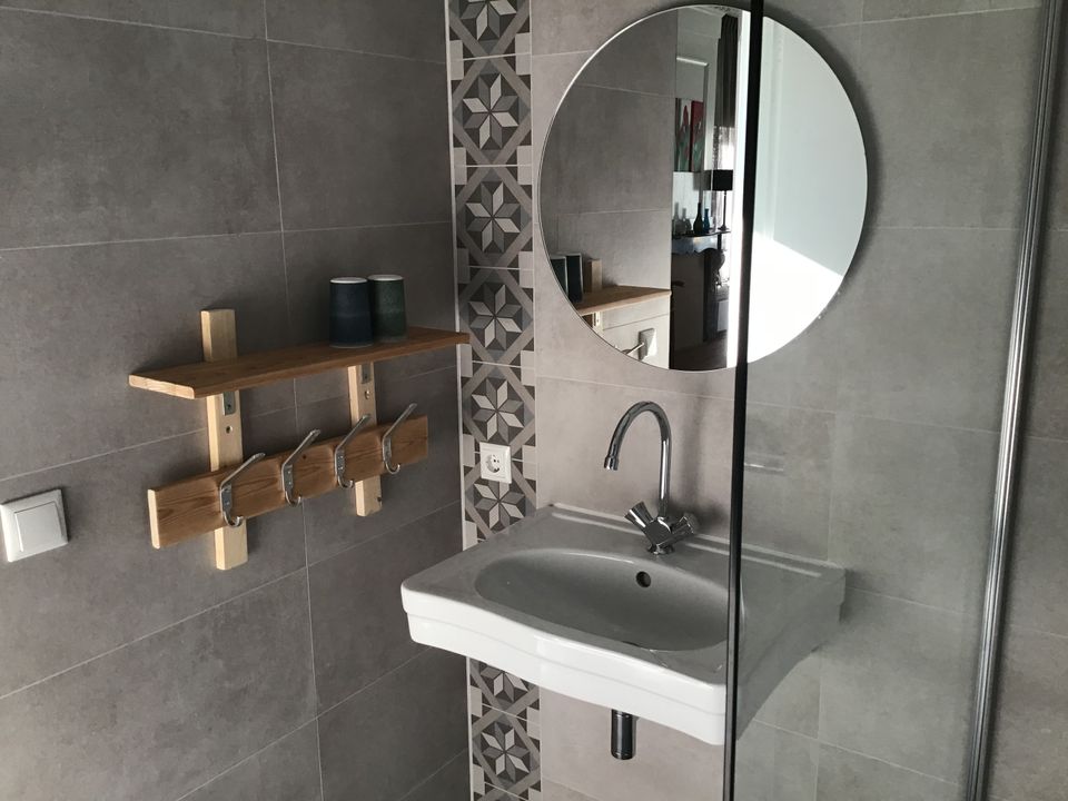 De badkamer heeft een wasbak en een moderne inloopdouche. Ontdek de unieke sfeer van de accommodatie met authentieke elementen zoals een marmeren schouw, paneeldeuren en binnenluiken.