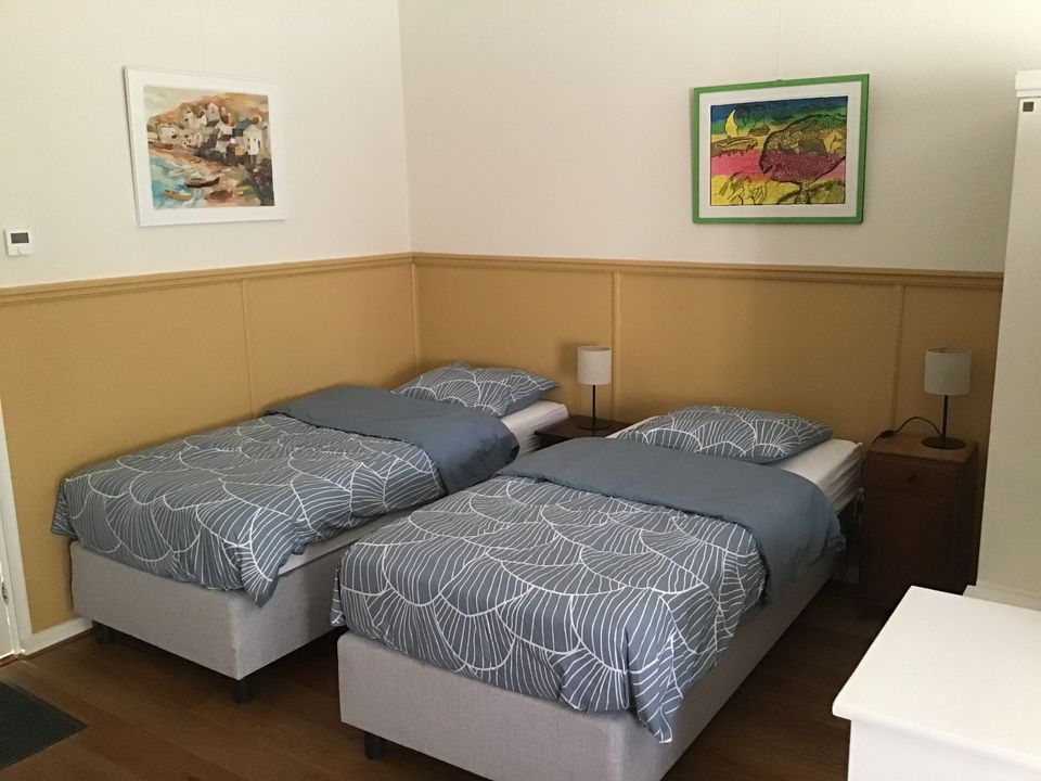 De ruime tweepersoonskamer heeft een eigen ingang voor maximale privacy. Met twee comfortabele eenpersoons boxspring bedden en een handige zit-slaapbank is het een knusse plek om te ontspannen. De woonkamer biedt een eettafel en een kitchenette met een kleine koelkast, waterkoker en koffiezetapparaat.