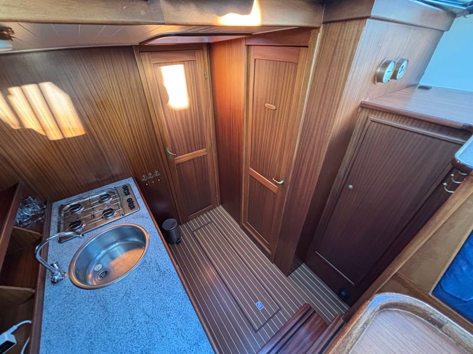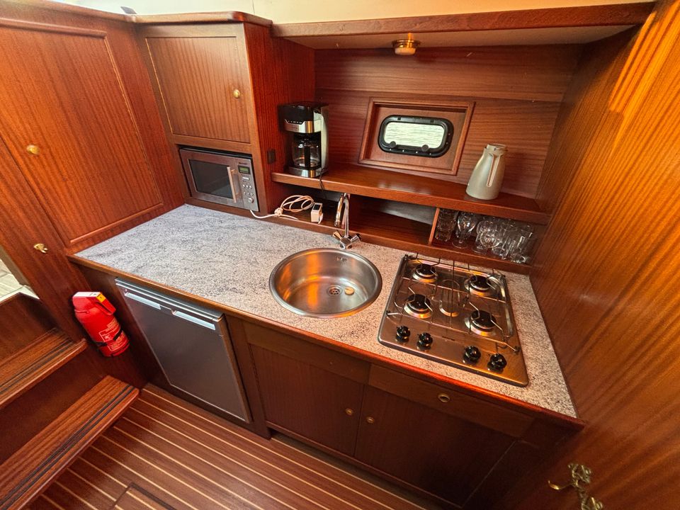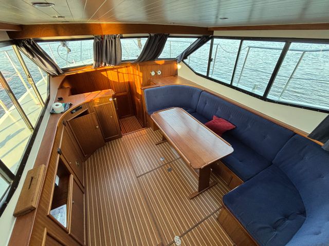 In de salon bevindt zich een ruime U-bank, hier kun je 's avonds lekker dineren of met slecht weer gezellig spelletjes spelen. De nette keuken is uitgerust met een 4-pits gastoestel, een ruime koelkast, magnetron en koffiezetapparaat. Omdat het een groot schip is leent de Vri-Jon Contessa zich perfect voor een vakantie met het gehele gezin, kinderen hebben alle ruimte om zich uit te leven. Door de zwemtrap is de boot ideaal om met de zomerse temperaturen een lekker duik in het water te nemen! De buitenstuurstand bevindt zich onder een royale tent, je kunt hier comfortabel plaats nemen.