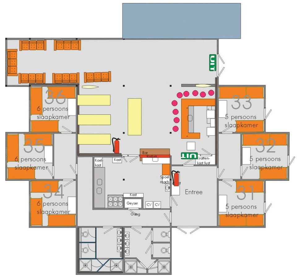 Een ruim vakantiehuis met 32 bedden en een ruime woonruimte voor 50 p.