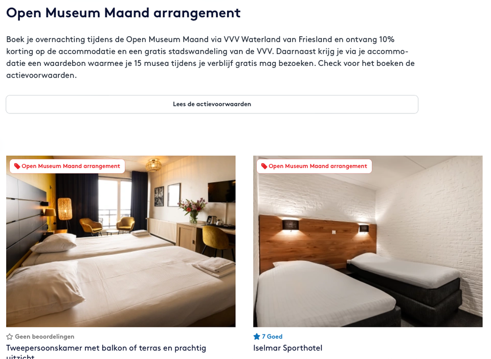 Onze leden met een logiesaccommodatie konden partner worden van de Open Museum Maand. Een webpagina met alle partners in combinatie met de Open Museum Maand werd gepromoot buiten Friesland. Men kon een Open Museum Maand arrangement boeken: een overnachting met korting, gratis museumbezoek en een gratis stadswandeling. Dit was te boeken via de ondernemer en grotendeels ook via ons zoek en boek systeem. Via een speciale actietoevoeging werden deze arrangementen zichtbaar op onze website.