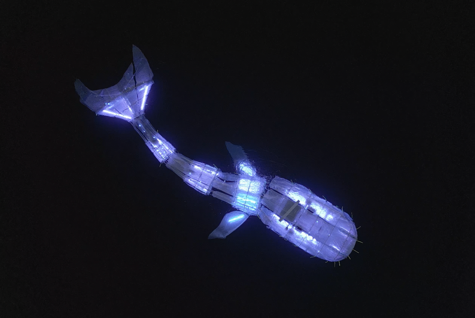 Meterslange techno-walvis duikt op in Sneeker gracht tijdens kunstproject Walfisk