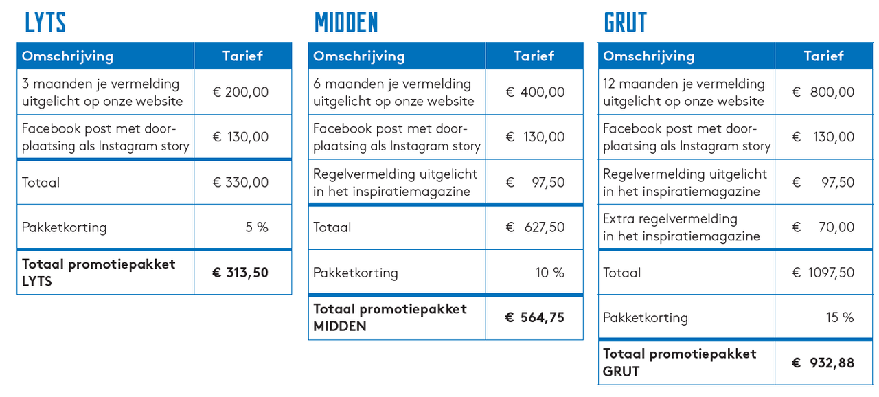 Extra promotie voor je bedrijf kan op drie verschillende manieren. Je kunt op onze website als TIP worden genoemd, promotie krijgen via onze social media kanalen of een extra regelvermelding in het magazine. Met het promotiepakket Lyts, Midden of Grut kies je zelf voor de mogelijkheden om je bedrijf extra onder de aandacht te brengen en welke korting je ontvangt.