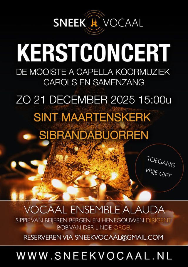 Vocaal ensemble Alauda zingt een warm en afwisselend kerstprogramma met a capella koormuziek en bekende carols waar iedereen bij kan aansluiten. Het concert staat onder leiding van dirigent Sippie van Beijeren Bergen en Henegouwen en Bob van der Linde verzorgt het orgelspel. Het is gratis toegankelijk en reserveren kan via sneekvocaal@gmail.com.Ā
