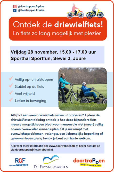 De Driewielfietsontdekdag is een uniek evenement waar je verschillende modellen driewielfietsen kunt uitproberen en alles kunt leren over de voordelen van deze fietsen. Het is speciaal bedoeld voor mensen die zich onzeker of onveilig voelen op een tweewielfiets en toch willen blijven fietsen.