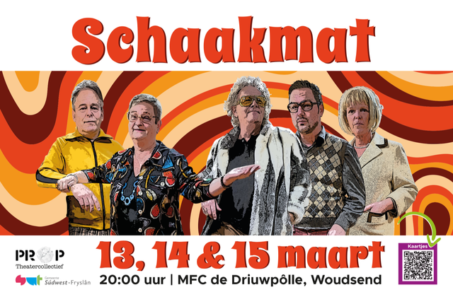 Schaakmat is het nieuwste theaterproject van PROP Theatercollectief. Gemaakt door een groep mensen die na mienskipstheatervoorstelling Wout’s End? zin hadden in iets nieuws. Gemeente Súdwest-Fryslân maakt ook deze voorstelling financieel mogelijk.