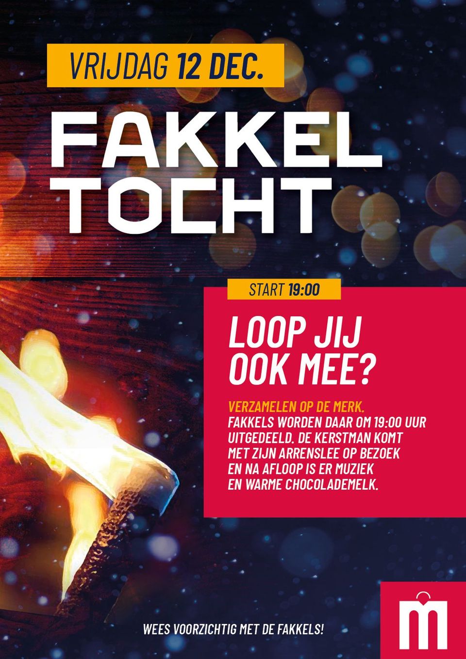 Loop je mee met de fakkeltocht? We verzamelen op de Merk waar om 19.00 uur de fakkels worden uitgedeeld. De Kerstman komt langs met zijn arrenslee en na afloop is er muziek en warme chocolademelk.