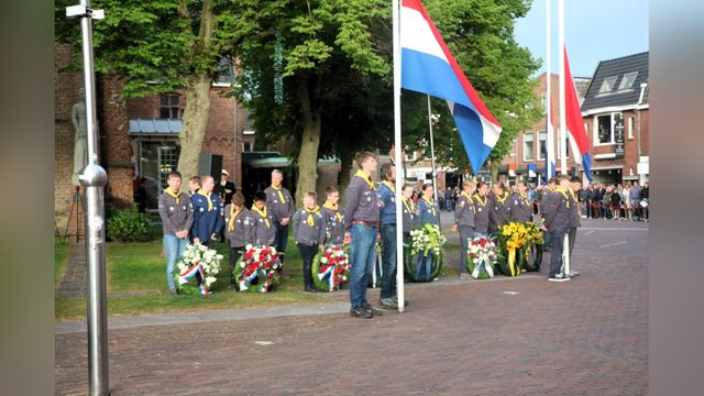 Kranslegging door diverse verenigingen bij het oorlogsmonument in Sneek.