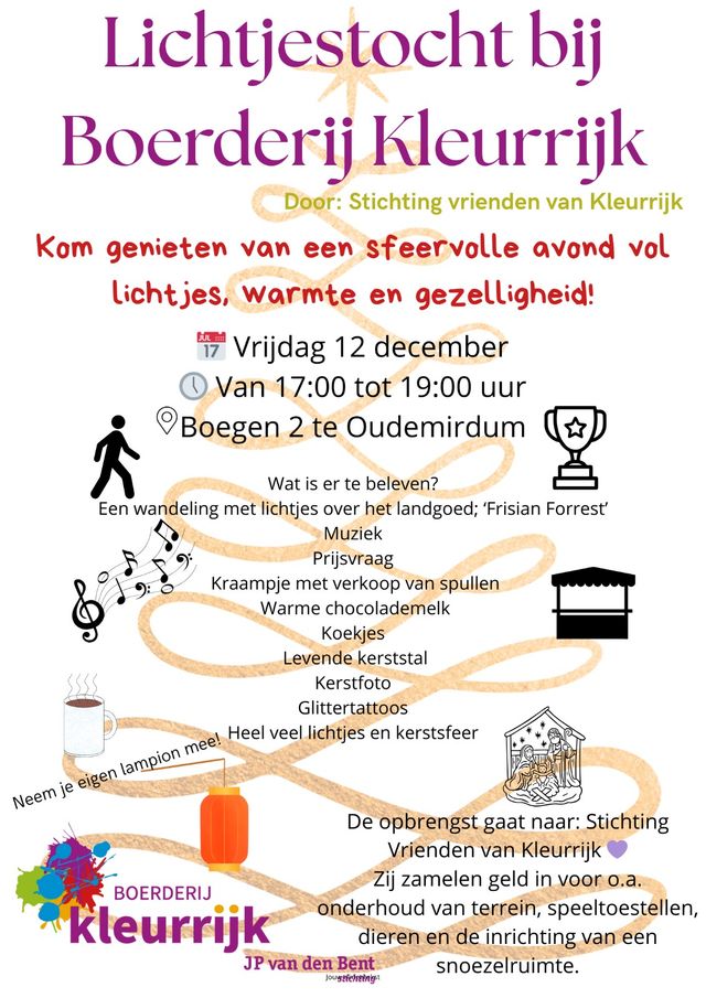 Vrijdag 12 december zal het landgoed van Boerderij Kleurrijk helemaal in kerstsferen zijn. Van 17 uur tot 19 uur kun je o.a. genieten van de mooie locatie, lichtjes, muziek, glittertattoos, levend kerststal, kraampjes en warme chocolade melk en/of snert.
